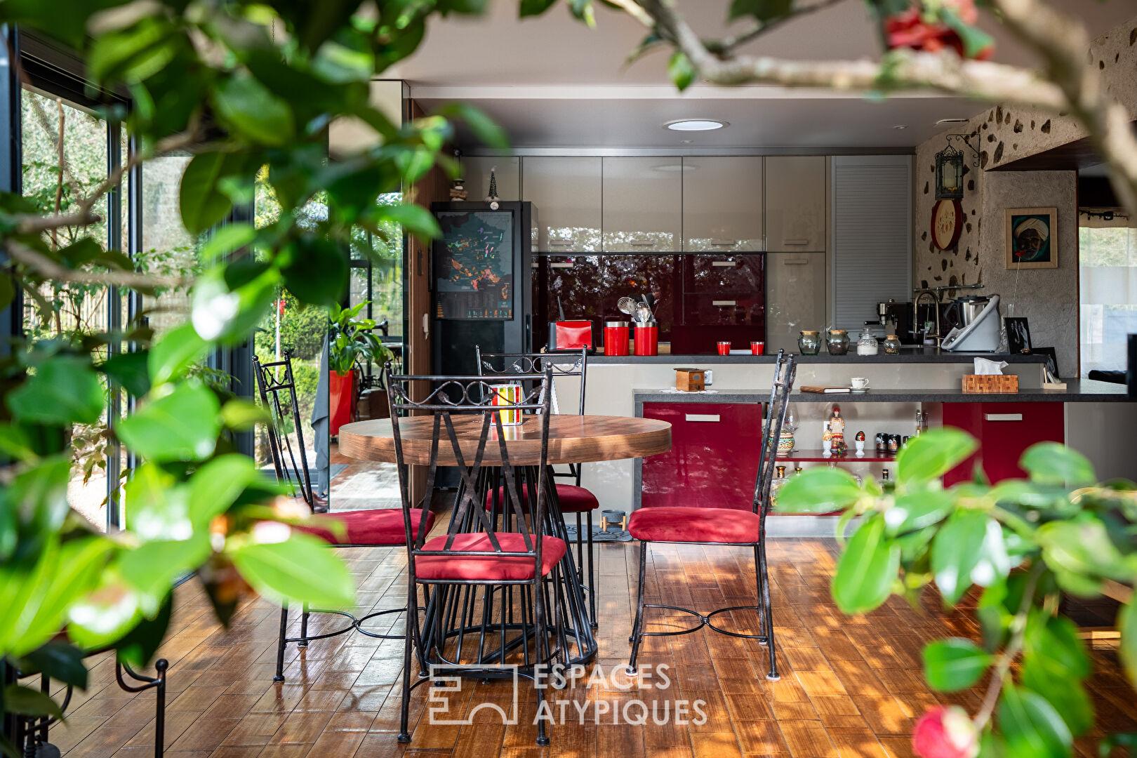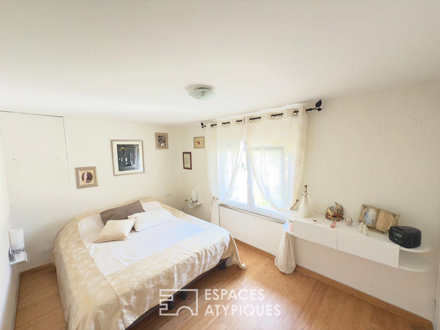 Le rez-de-chaussée s’organise autour d’un bureau, d’un salon chaleureux agrémenté d’une cheminée avec insert, ainsi que d’une grande cuisine américaine baignée de lumière, bénéficiant d’un accès direct à la terrasse et au jardin paysagé. Une chambre, une salle de bain et un WC indépendant complètent ce niveau, offrant une vie de plain-pied appréciable.