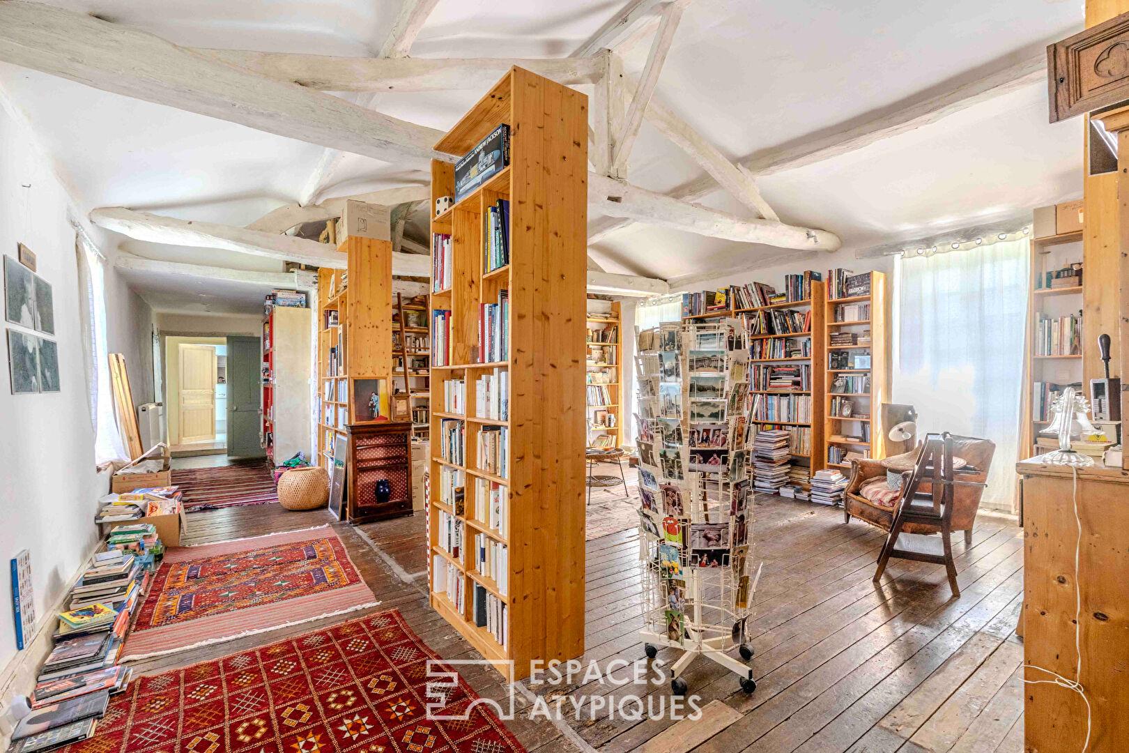 L’étage distribue trois chambres supplémentaires, une bibliothèque sous charpente apparente et deux salles de bains, permettant d’envisager une vie de famille confortable ou l’accueil d’invités en toute indépendance.