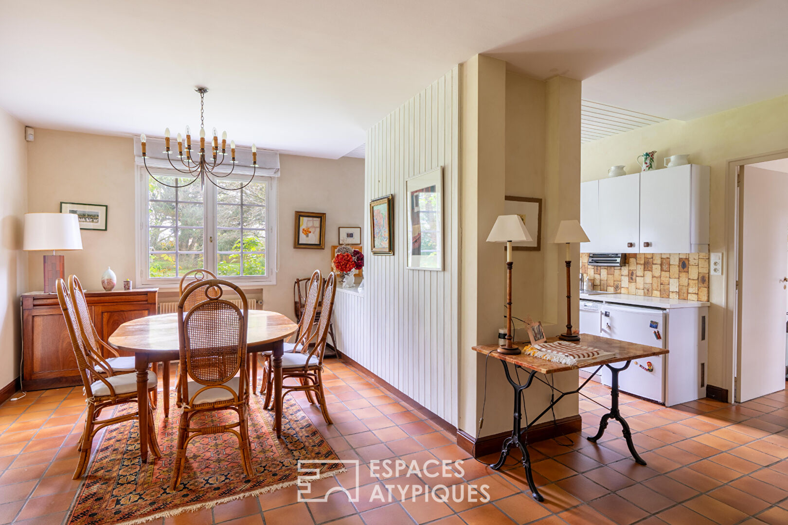 Propriété en plein vignoble, au coeur de Vallet, à seulement une demi-heure de Nantes. Cette demeure unique, construite par un architecte en 1971, se cache au coeur d’un parc luxuriant de plus d’un hectare. Avec une superficie habitable de 372 m² répartie entre deux constructions distinctes, cette résidence offre un cadre de vie incomparable.