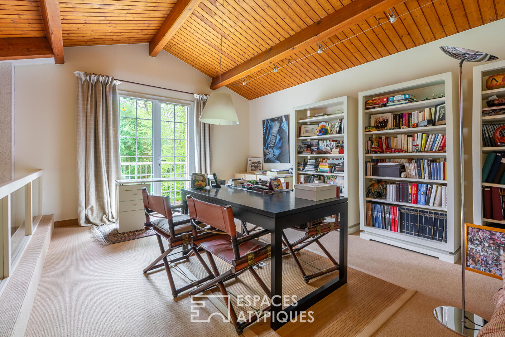 Dès l’entrée, un hall spacieux débouche sur une pièce de vie impressionnante, dotée d’un plafond cathédrale, d’une cheminée et d’un espace salle à manger qui s’ouvrent sur un jardin d’hiver attenant à la cuisine équipée. Les baies vitrées illuminent l’espace et offrent une vue imprenable sur le parc. Une mezzanine aménagée en bureau donne accès à une suite parentale avec sa propre salle de bain.