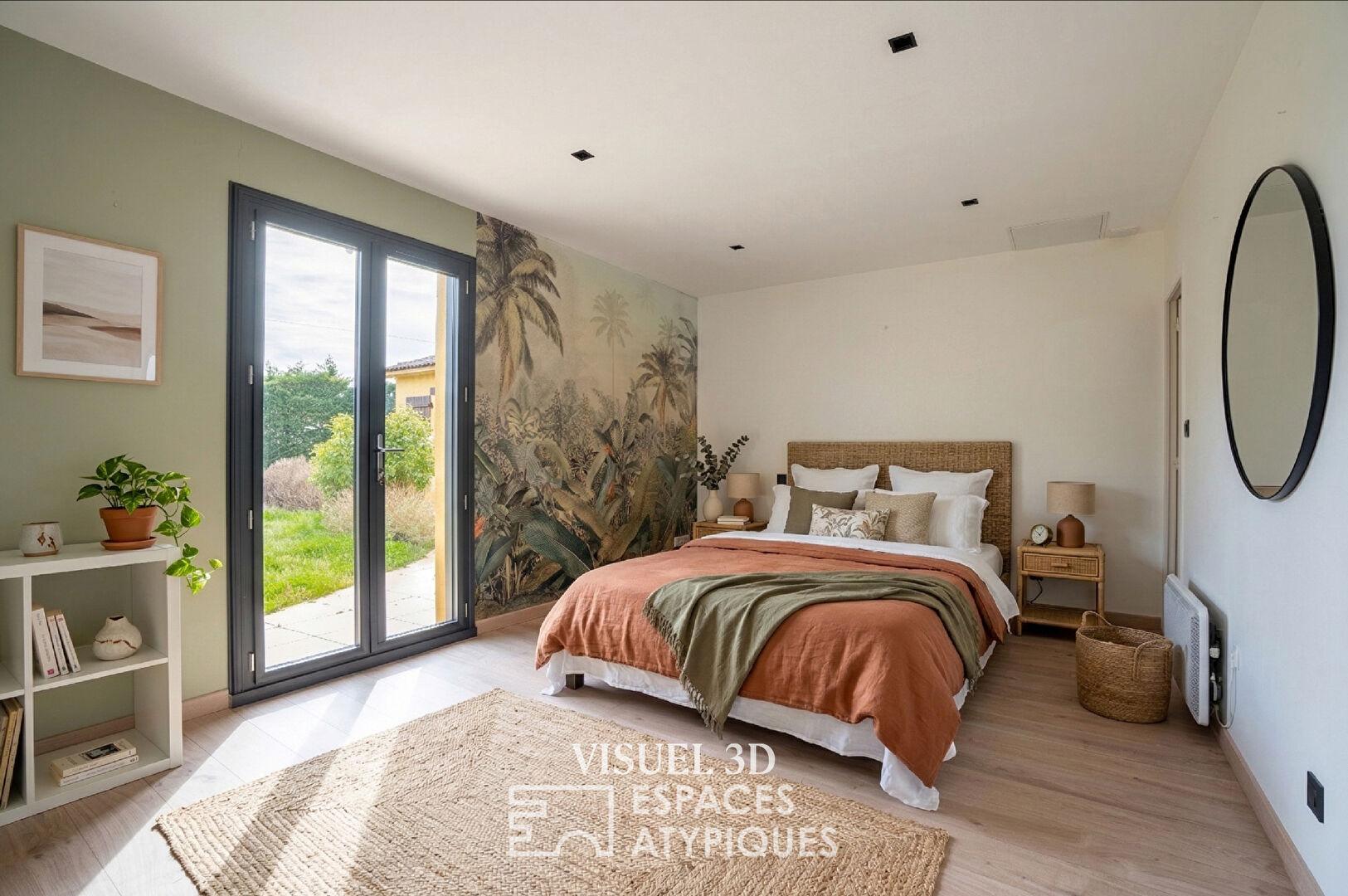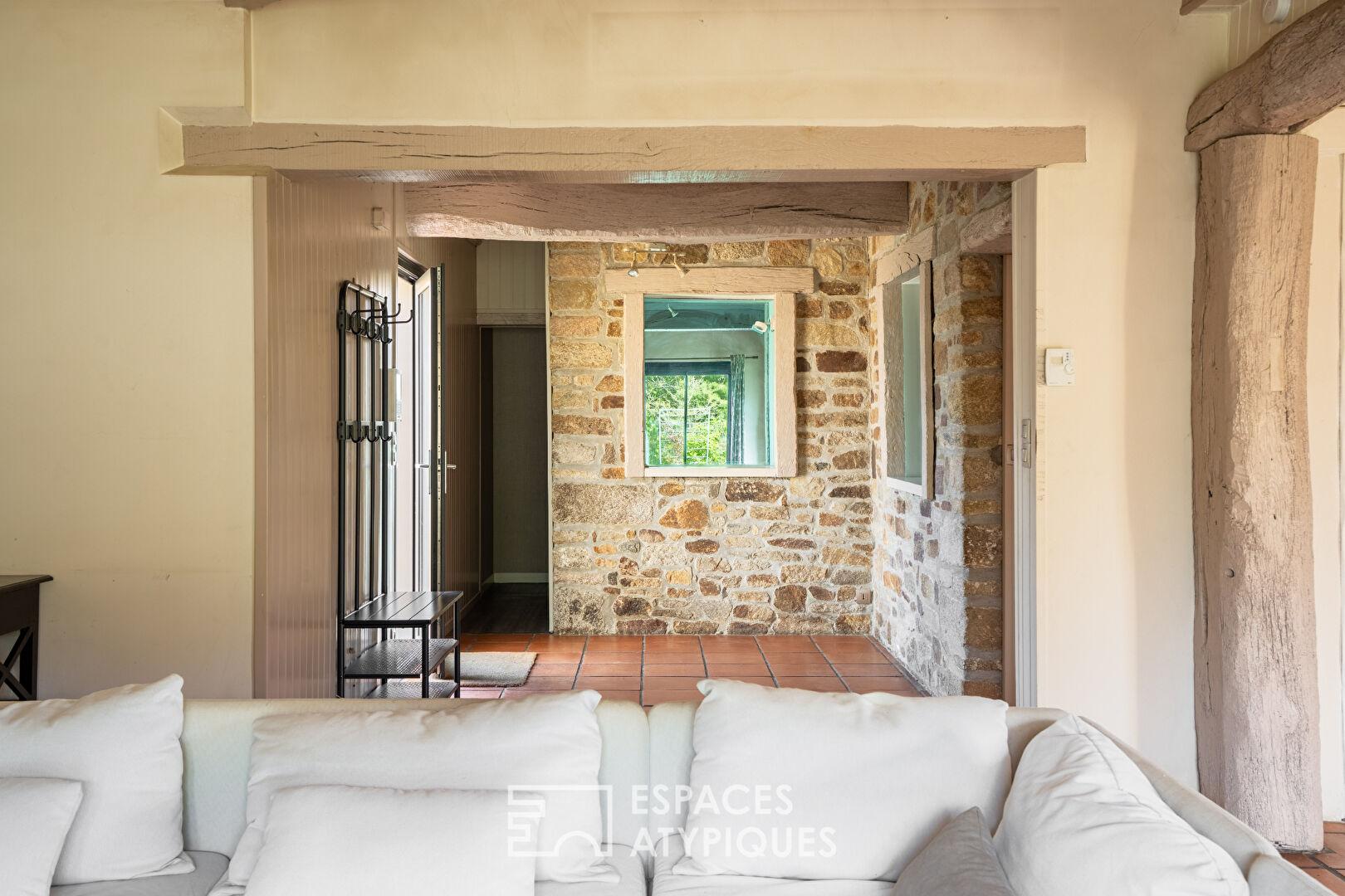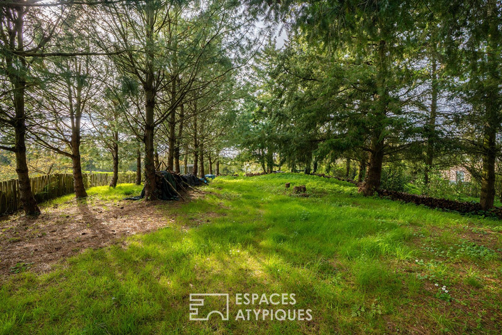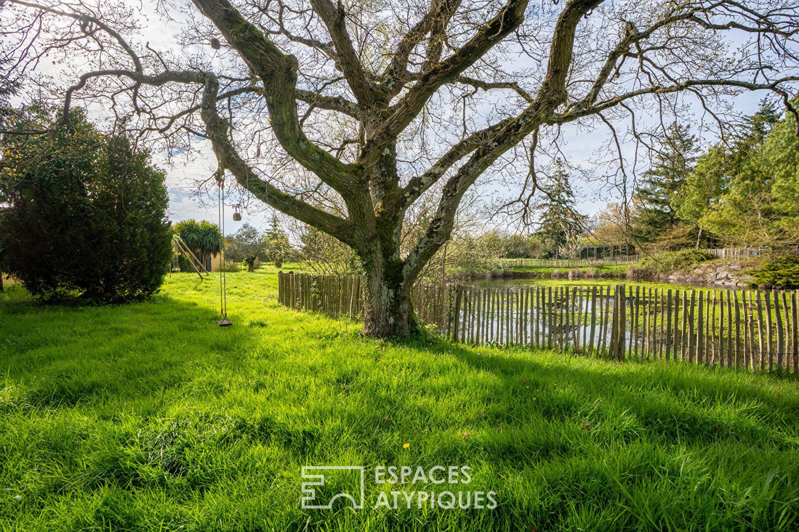 À l’extérieur, le terrain arboré et parfaitement entretenu révèle un cadre de vie privilégié, entre étang, espaces boisés et larges ouvertures sur la nature. L’absence totale de vis-à-vis garantit une intimité appréciable. La dépendance, non comprise dans la surface principale, permet d’envisager la création d’un gîte, d’un studio indépendant ou d’une activité de chambres d’hôtes. Un préau et plusieurs abris de jardin complètent les prestations de ce bien.