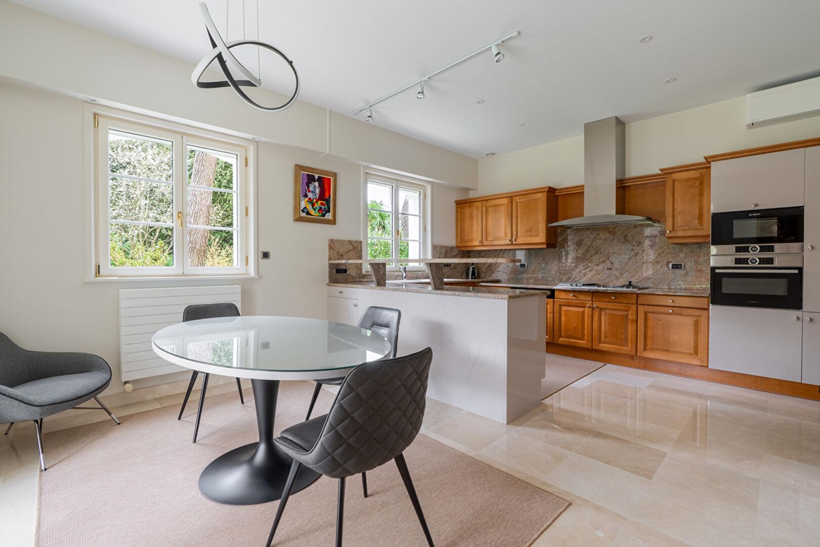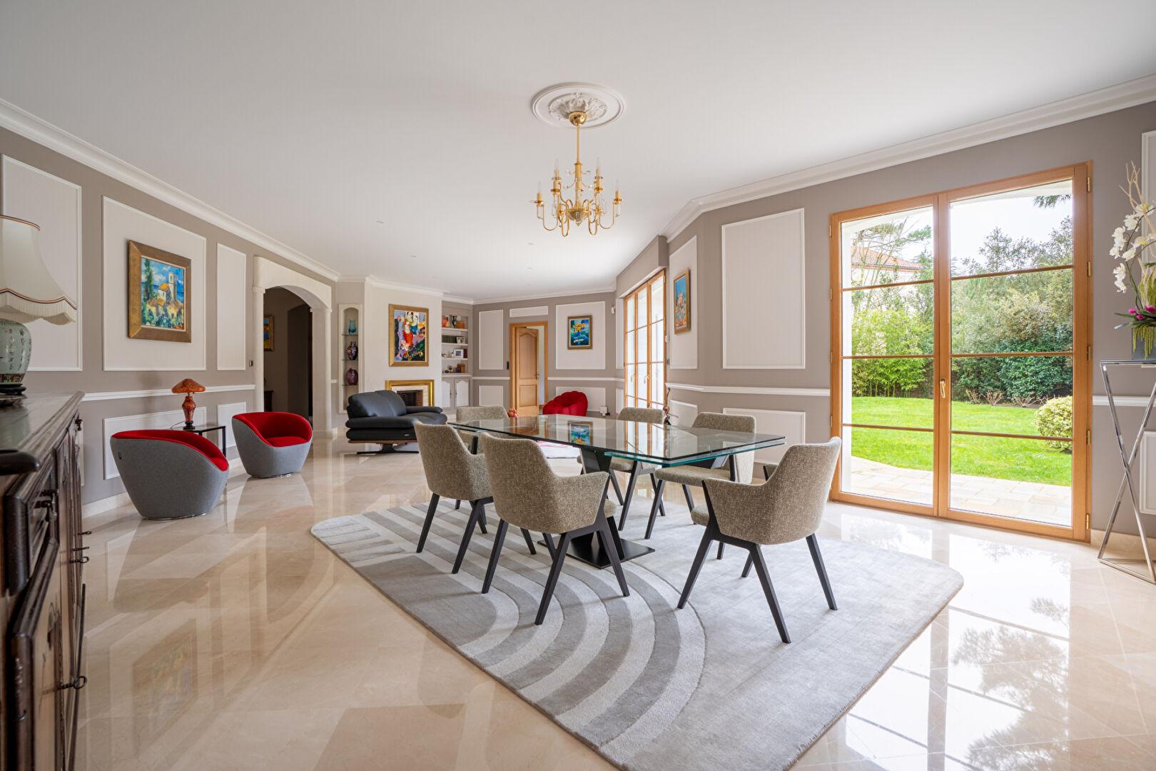 Ici, le temps semble suspendre son vol. Le jardin de 1 800 m², véritable écrin de verdure aux essences choisies, enveloppe la demeure d’un silence absolu et d’une intimité rare. Dès le seuil, le ton est donné : le marbre au sol de l’entrée guide vos pas vers vaste séjour baigné d’une lumière douce, cet espace de vie s’efface devant la nature grâce à de larges ouvertures qui invitent le jardin à l’intérieur.