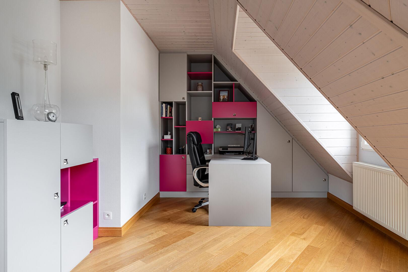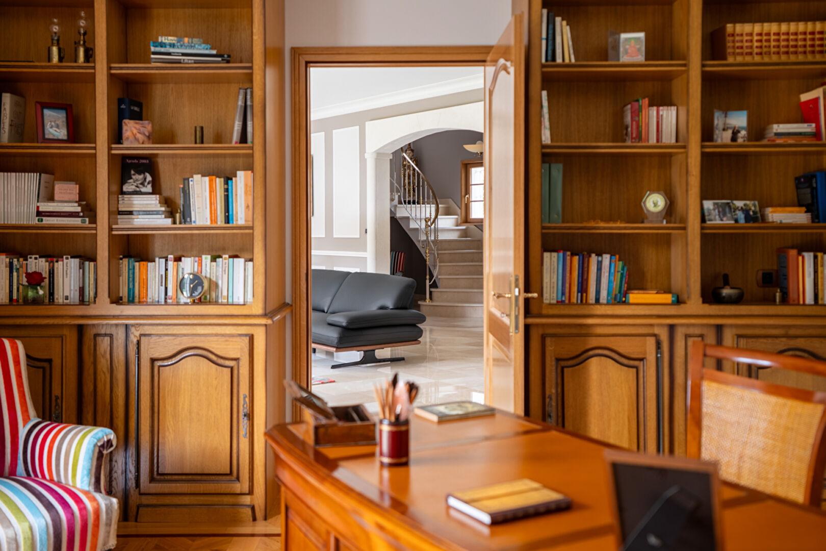 Le matin, la cuisine contemporaine devient le coeur battant de la maison. On y prépare le café avant de rejoindre la terrasse pour un petit-déjeuner en plein air, face à la douceur de son parc. Pour les moments d’étude ou de réflexion, un bureau paré d’une bibliothèque en bois sculpté offre une atmosphère feutrée, presque hors du temps.
