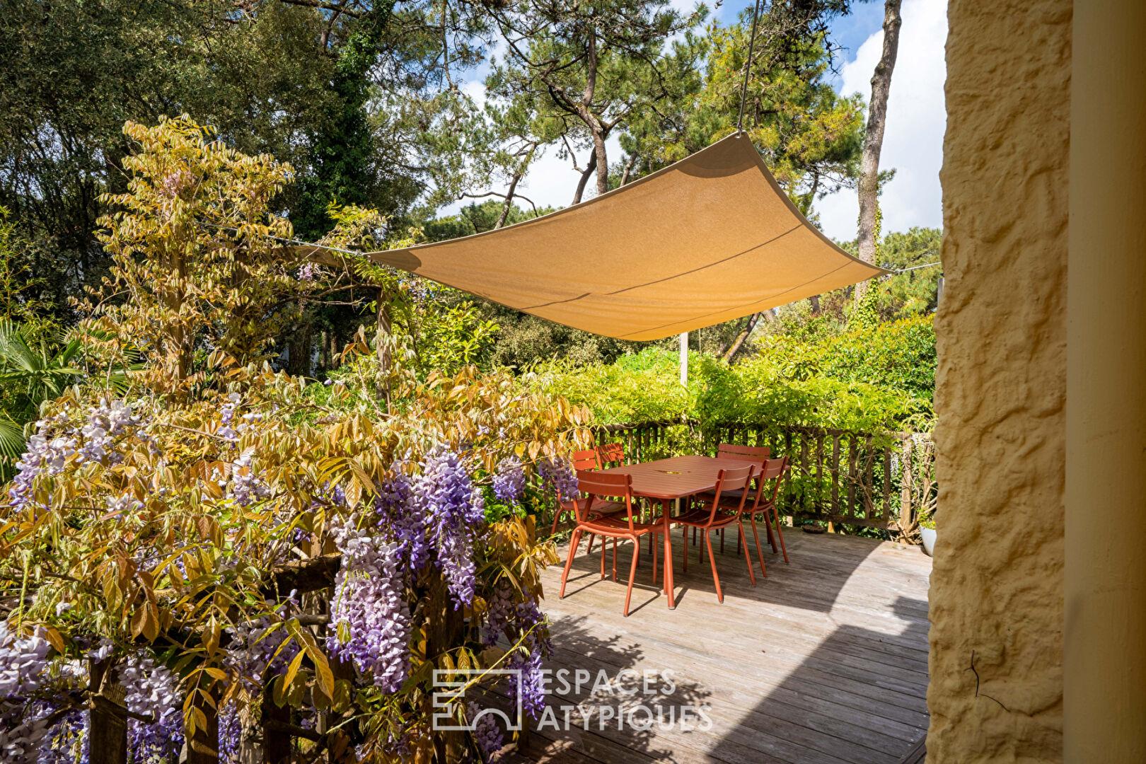 Depuis le salon vous accédez directement à une grande terrasse suspendue sous la canopée des pins pour prolonger vos réceptions en plein air dans un calme absolu