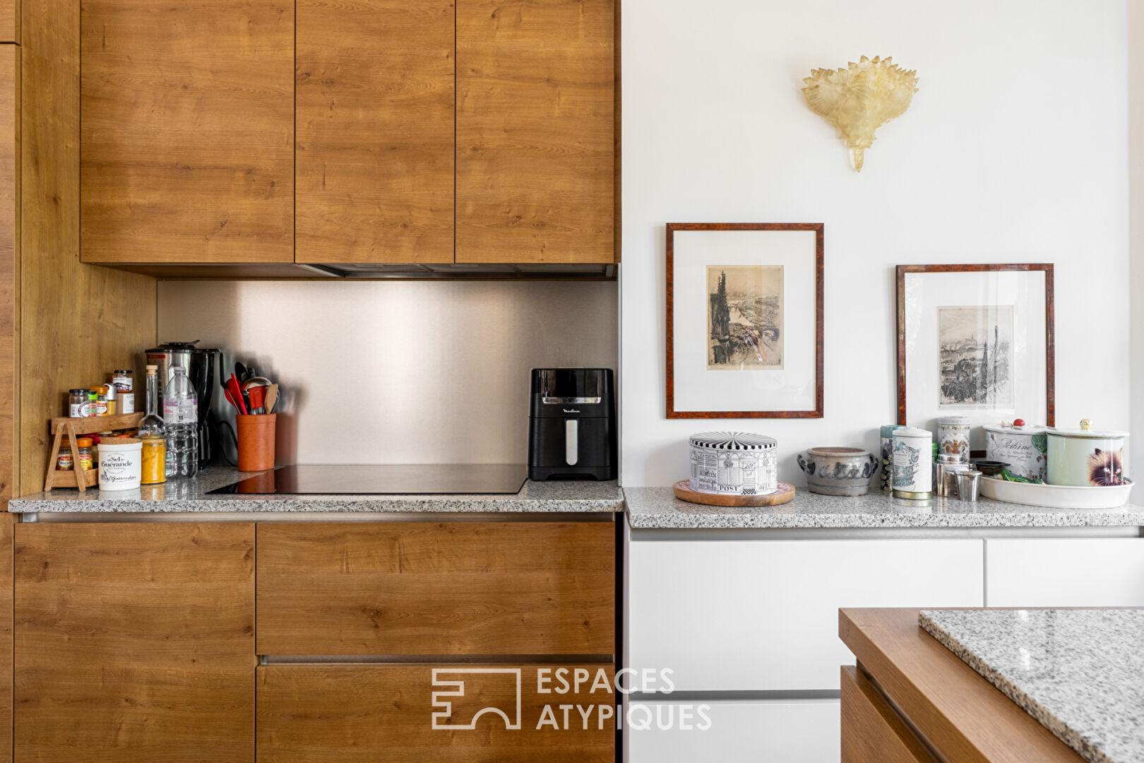 L’étage noble dévoile une entrée majestueuse menant vers une vaste pièce de vie baignée de lumière où la cuisine aménagée et équipée s’ouvre harmonieusement sur le salon et la salle à manger