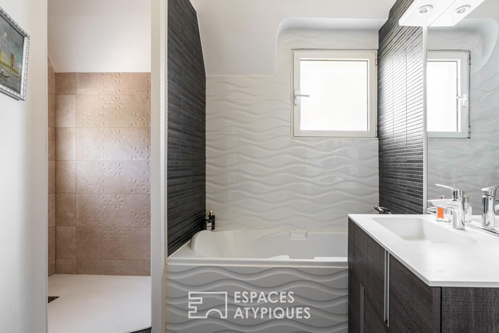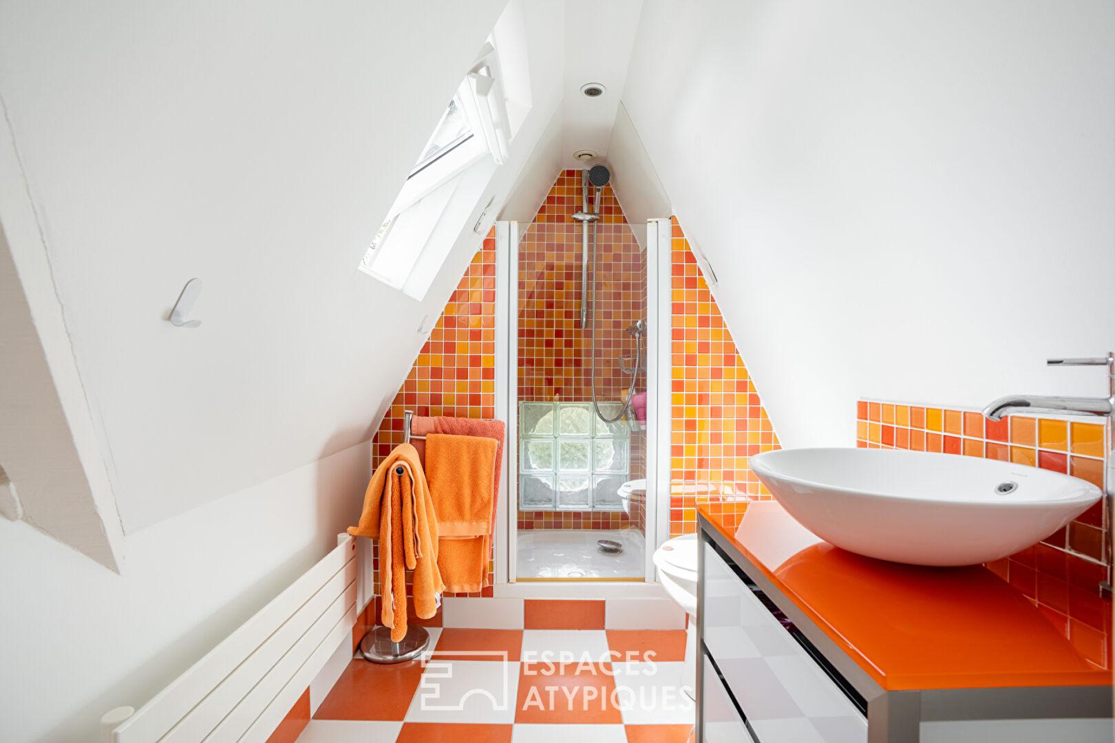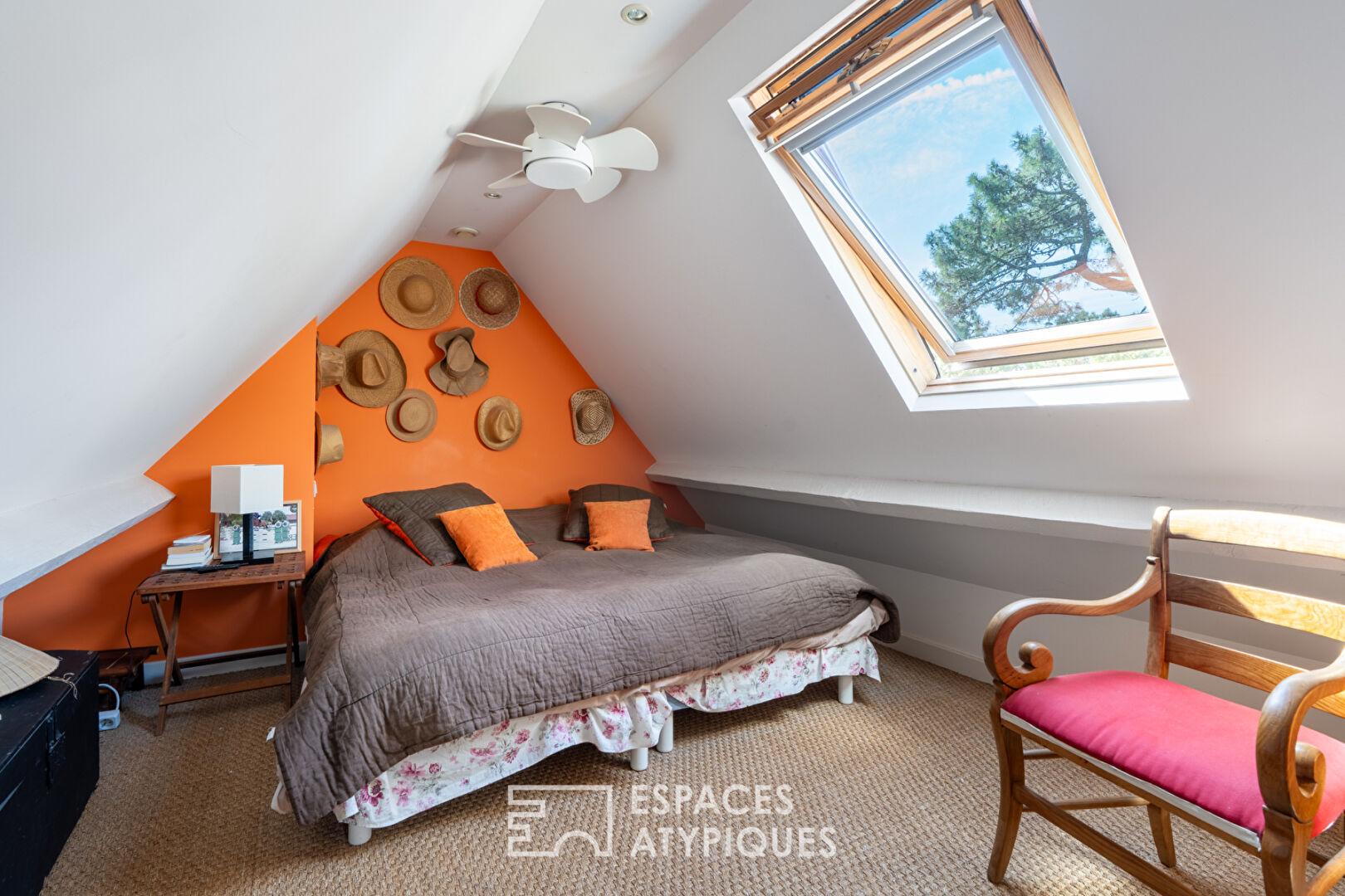 Le dernier étage sous les toits révèle un espace bureau inspirant idéal pour le télétravail ainsi qu’une chambre supplémentaire avec sa salle d’eau privative offrant un véritable refuge d’intimité