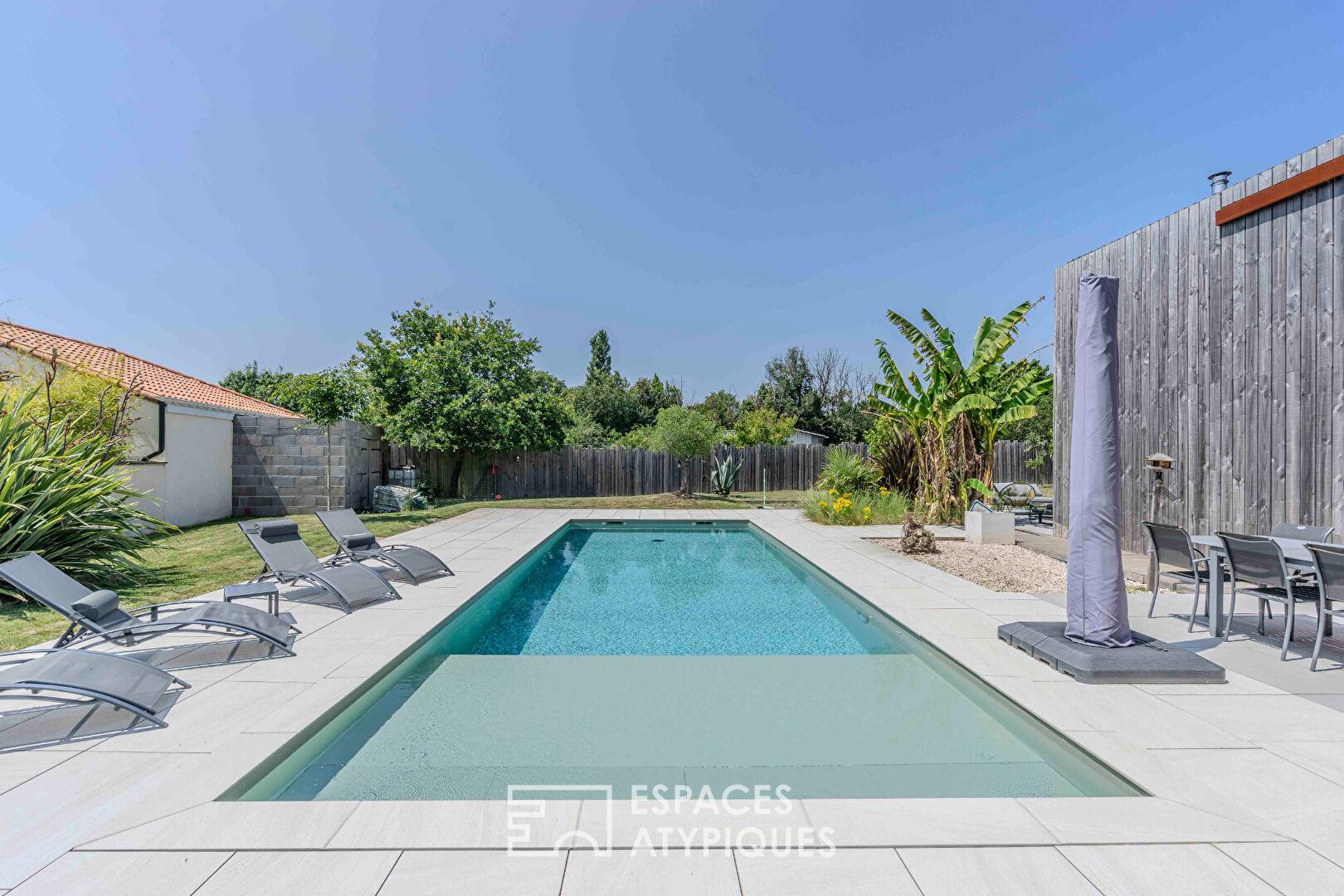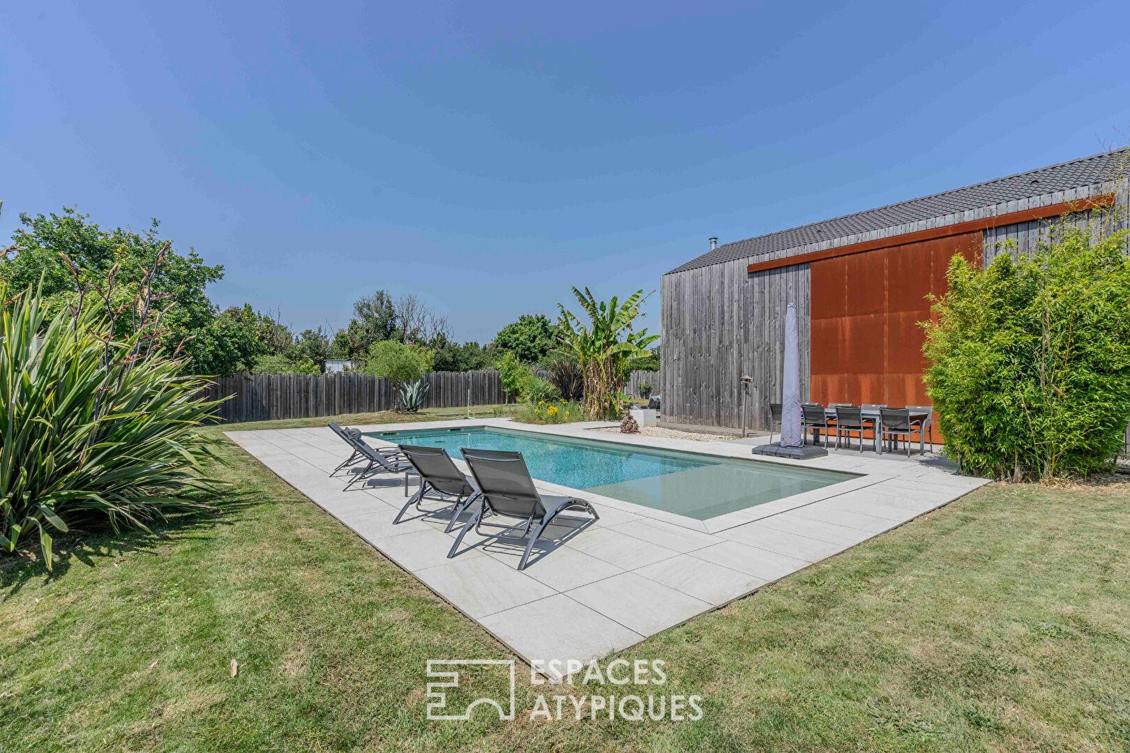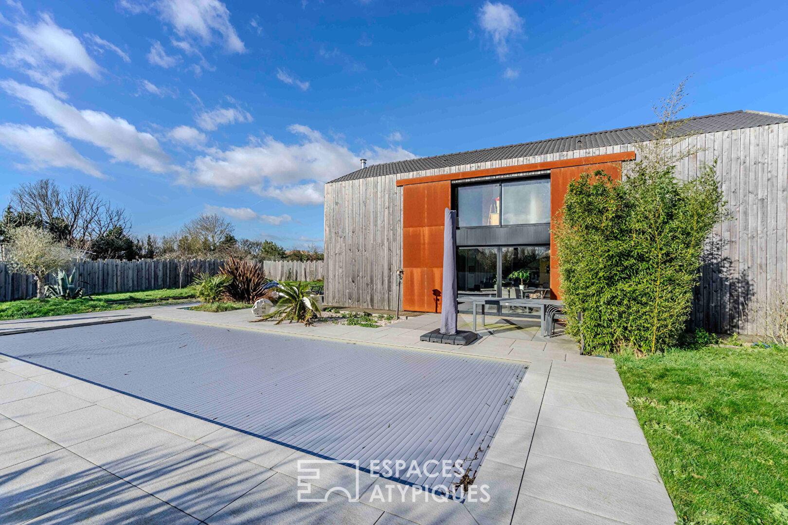 A 15 minutes des plages de Saint-Brévin et à seulement 2 km du bourg de Corsept, cette maison à l’architecture affirmée de 150 m² s’inscrit dans un hameau paisible, au cœur d’un environnement naturel préservé. Édifiée sur un terrain paysager de plus de 1 000 m², elle conjugue sérénité champêtre et proximité immédiate des commodités et des axes principaux.