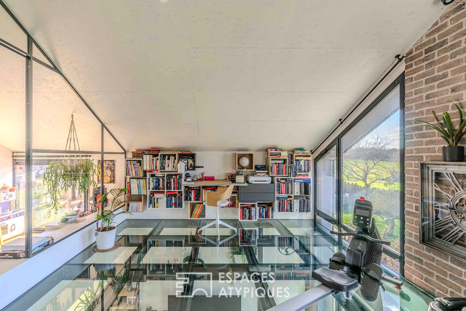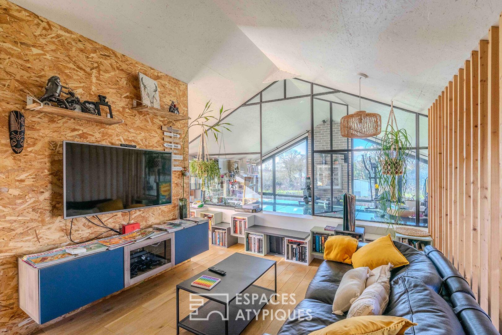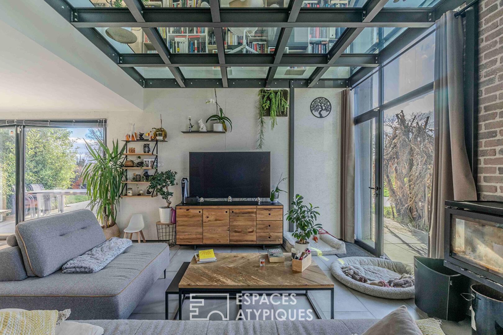 Derrière sa silhouette graphique mêlant bardage bois et larges surfaces vitrées, la maison révèle dès l’entrée une superbe pièce de vie. Baignée de lumière grâce à un plafond de verre et de vastes baies toute hauteur, elle profite d’une atmosphère lumineuse et évolutive au fil de la journée. Les matériaux dialoguent avec subtilité : mur en briques à l’esprit atelier, métal apparent, teintes douces et finitions soignées composent un ensemble à la fois chaleureux et résolument contemporain.