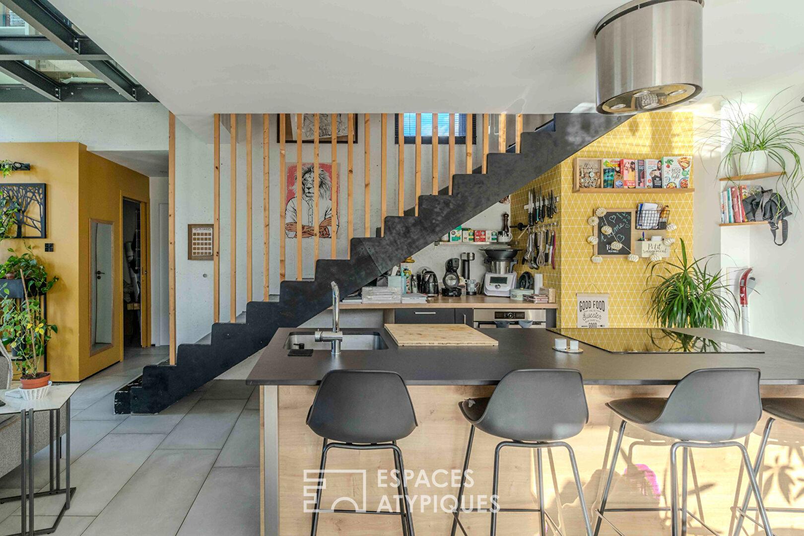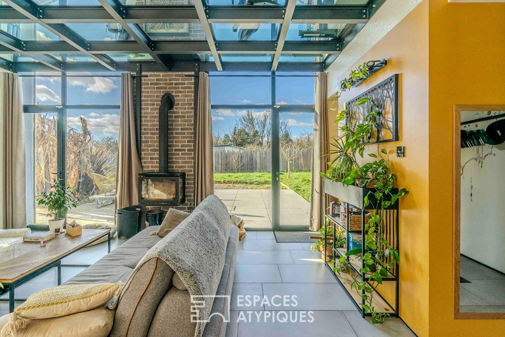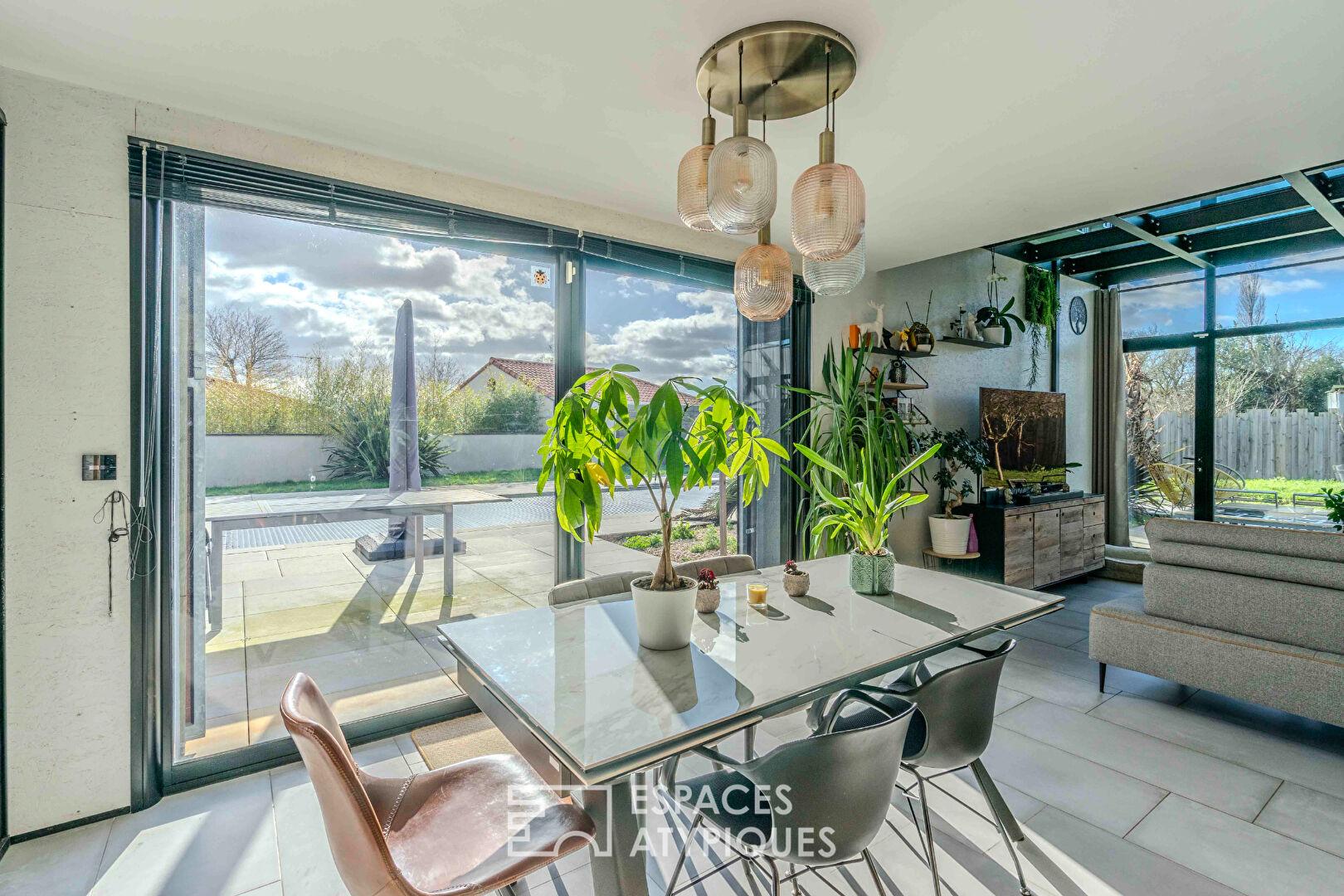 Derrière sa silhouette graphique mêlant bardage bois et larges surfaces vitrées, la maison révèle dès l’entrée une superbe pièce de vie. Baignée de lumière grâce à un plafond de verre et de vastes baies toute hauteur, elle profite d’une atmosphère lumineuse et évolutive au fil de la journée. Les matériaux dialoguent avec subtilité : mur en briques à l’esprit atelier, métal apparent, teintes douces et finitions soignées composent un ensemble à la fois chaleureux et résolument contemporain.
