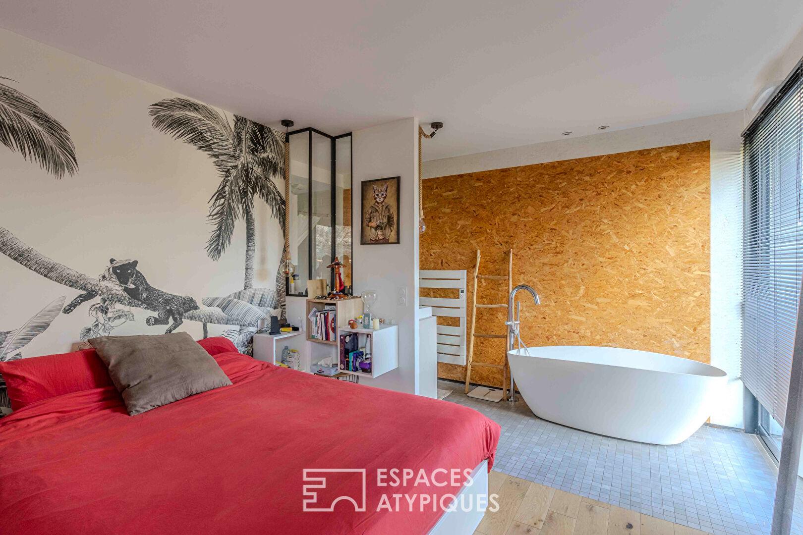 À l’étage, deux chambres lumineuses, une seconde salle d’eau ainsi qu’une mezzanine surplombant le séjour créent des espaces complémentaires modulables : bureau, salon lecture ou espace détente, chacun profitant d’une vue plongeante sur la pièce de vie.