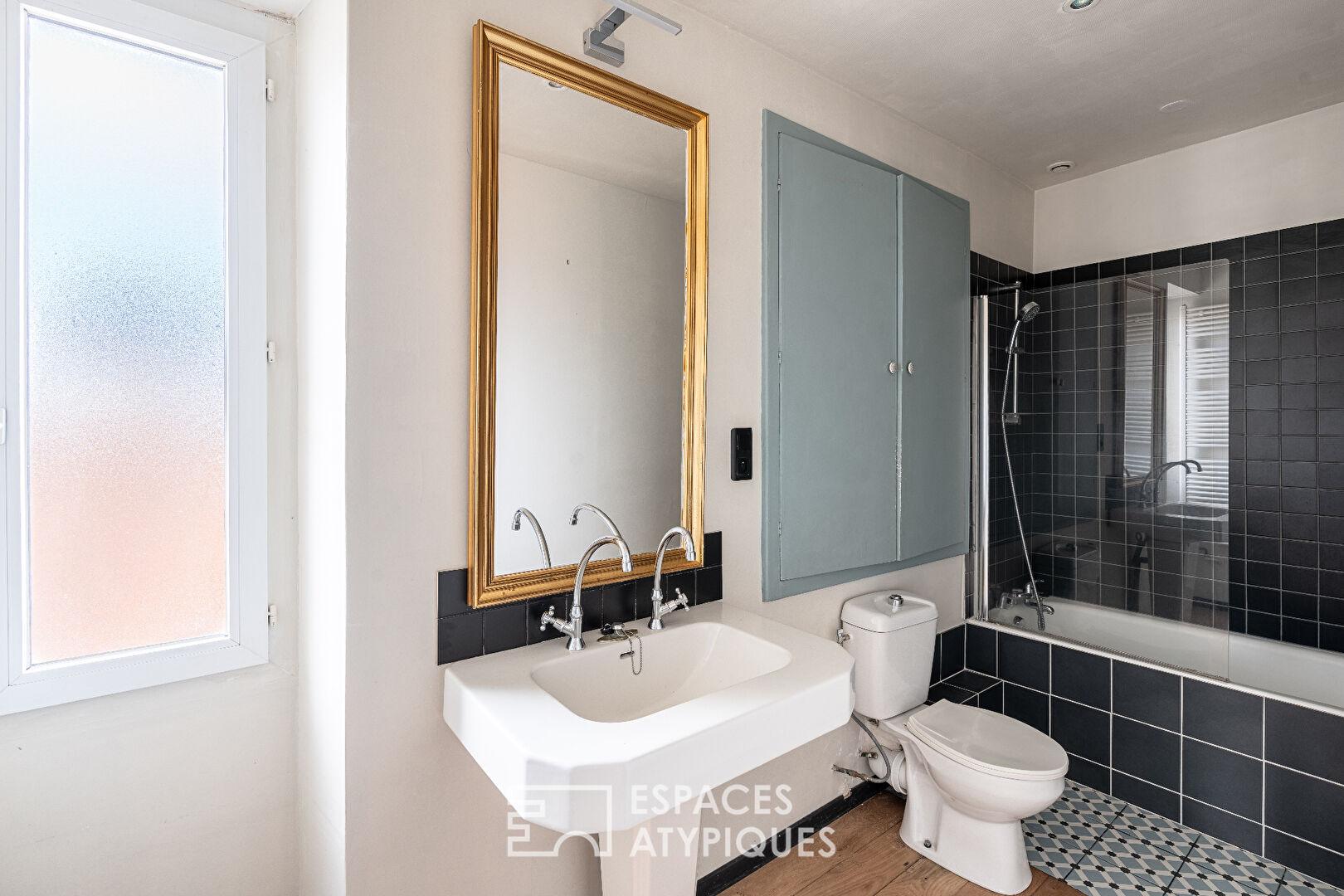 À l’étage, deux chambres sur parquet, une salle de bains ainsi qu’un espace bureau ou salle de jeux composent l’espace nuit.