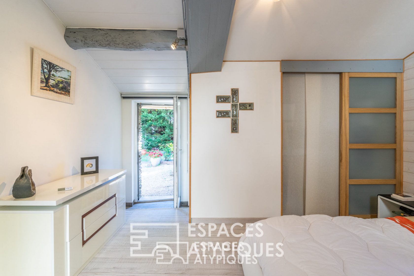 Coté nuit, une première chambre en rez-de-chaussée avec sa salle de bain s’ouvre sur la verdure et sur un charmant patio coloré. Deux escaliers (extérieur ou intérieur) permettent de regagner le premier étage, où l’on retrouve deux chambres claires et spacieuses, avec une salle d’eau attenante au solarium et le coin bureau avec de nombreux rangements.