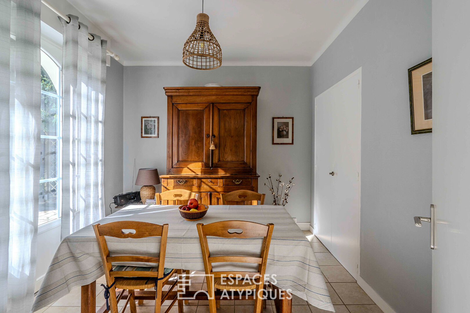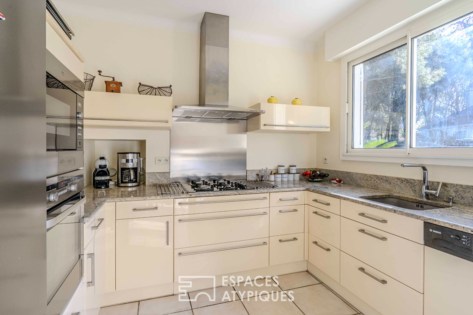 À l’extérieur, le jardin paysager, agrémenté de pins, crée un cadre naturel propice à la détente. La terrasse exposée plein sud permet de profiter des repas en plein air.
