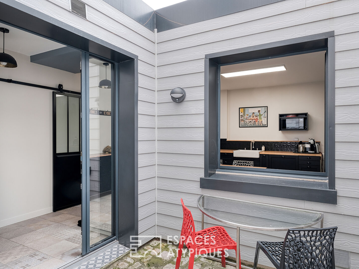 L’entrée se fait depuis la cour pavée, on y découvre une grande cuisine dînatoire entièrement équipée et sa buanderie attenante.