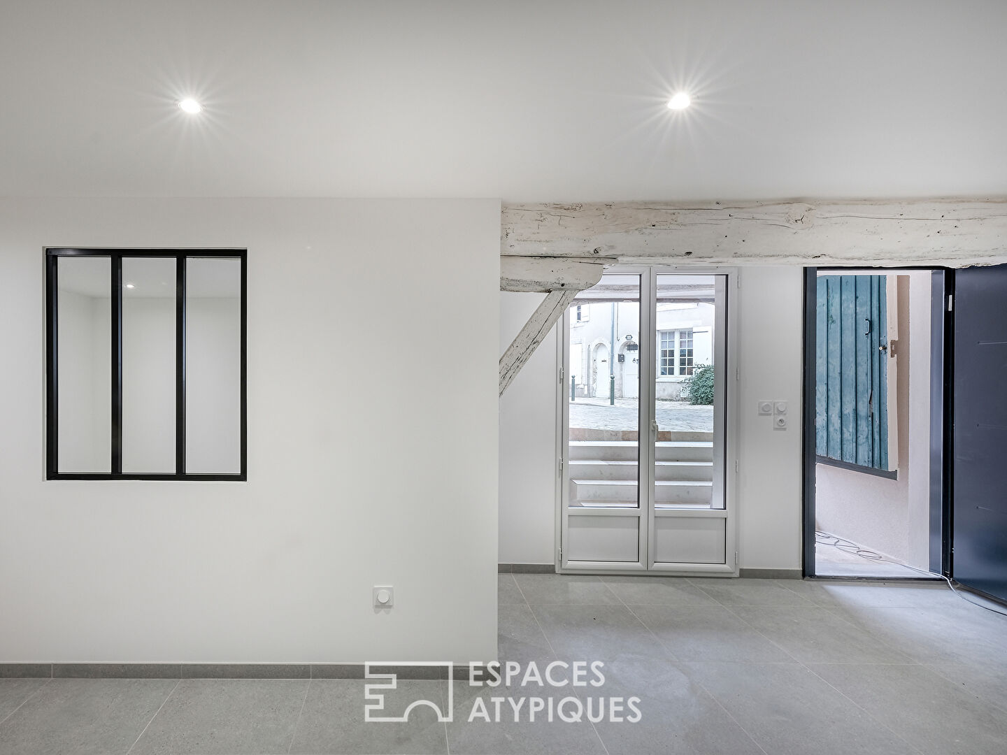 Insoupçonnable depuis la rue, l’entrée indépendante se cache derrière une ancienne porte d’atelier.
