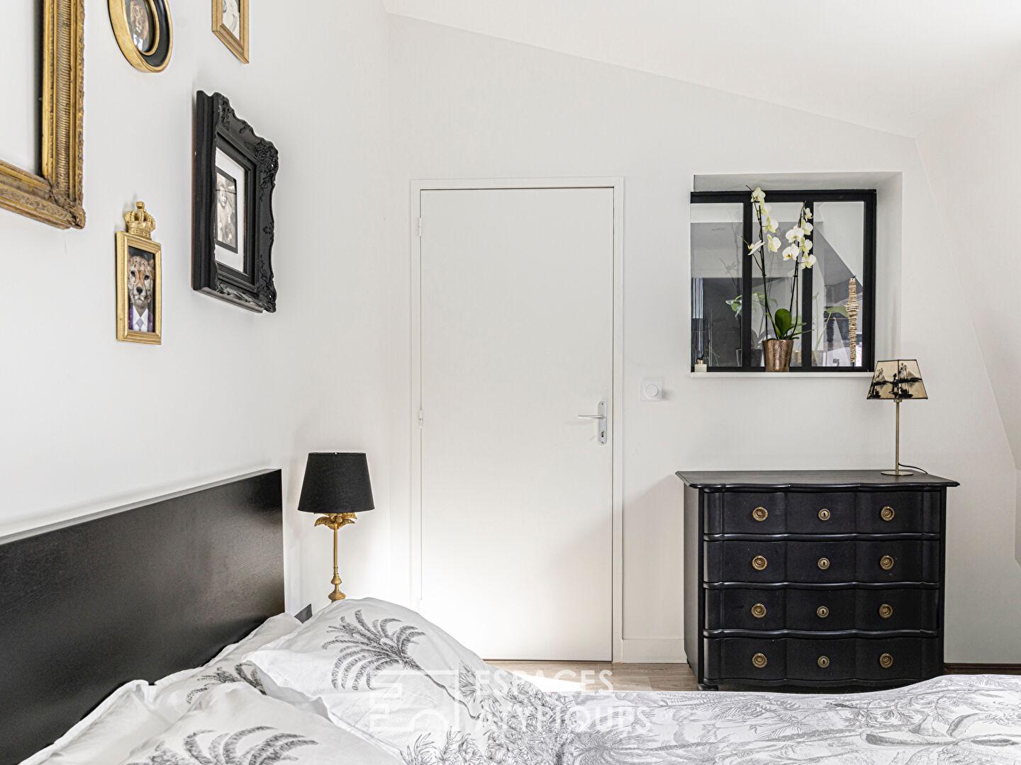 Côté nuit, une première chambre confortable se situe sur le niveau principal ainsi qu’une salle d’eau et un wc séparé . Un escalier mène ensuite à une mezzanine pleine de caractère, idéale pour un espace bureau, lecture ou détente, desservant une seconde chambre mansardée au cachet indéniable.