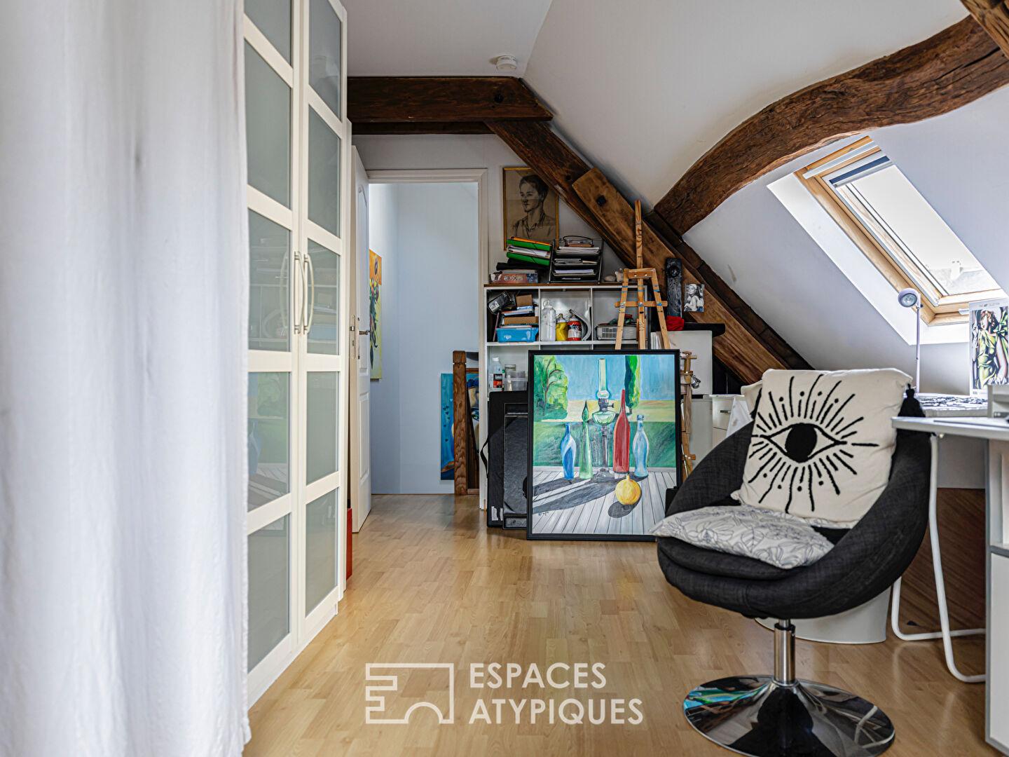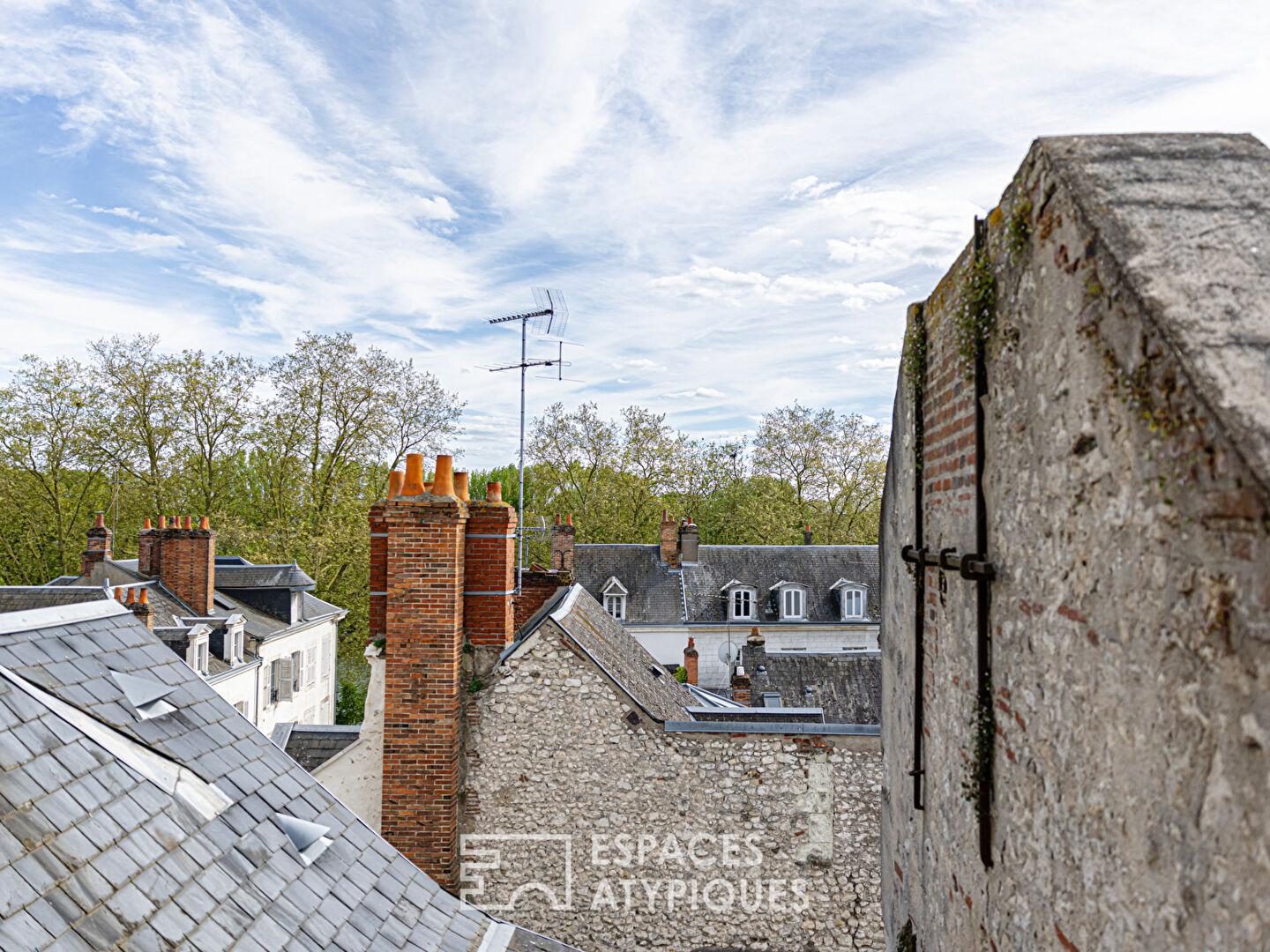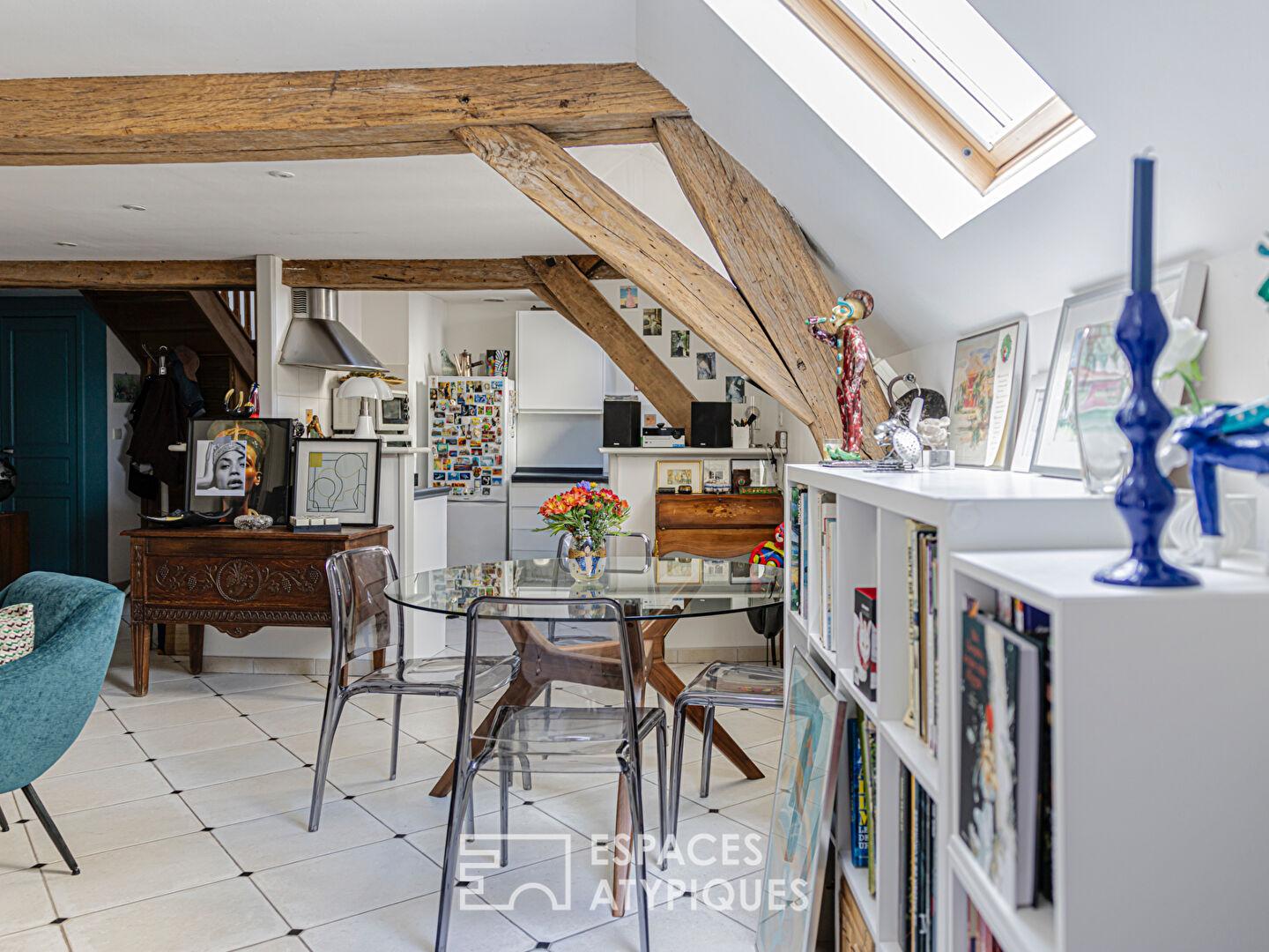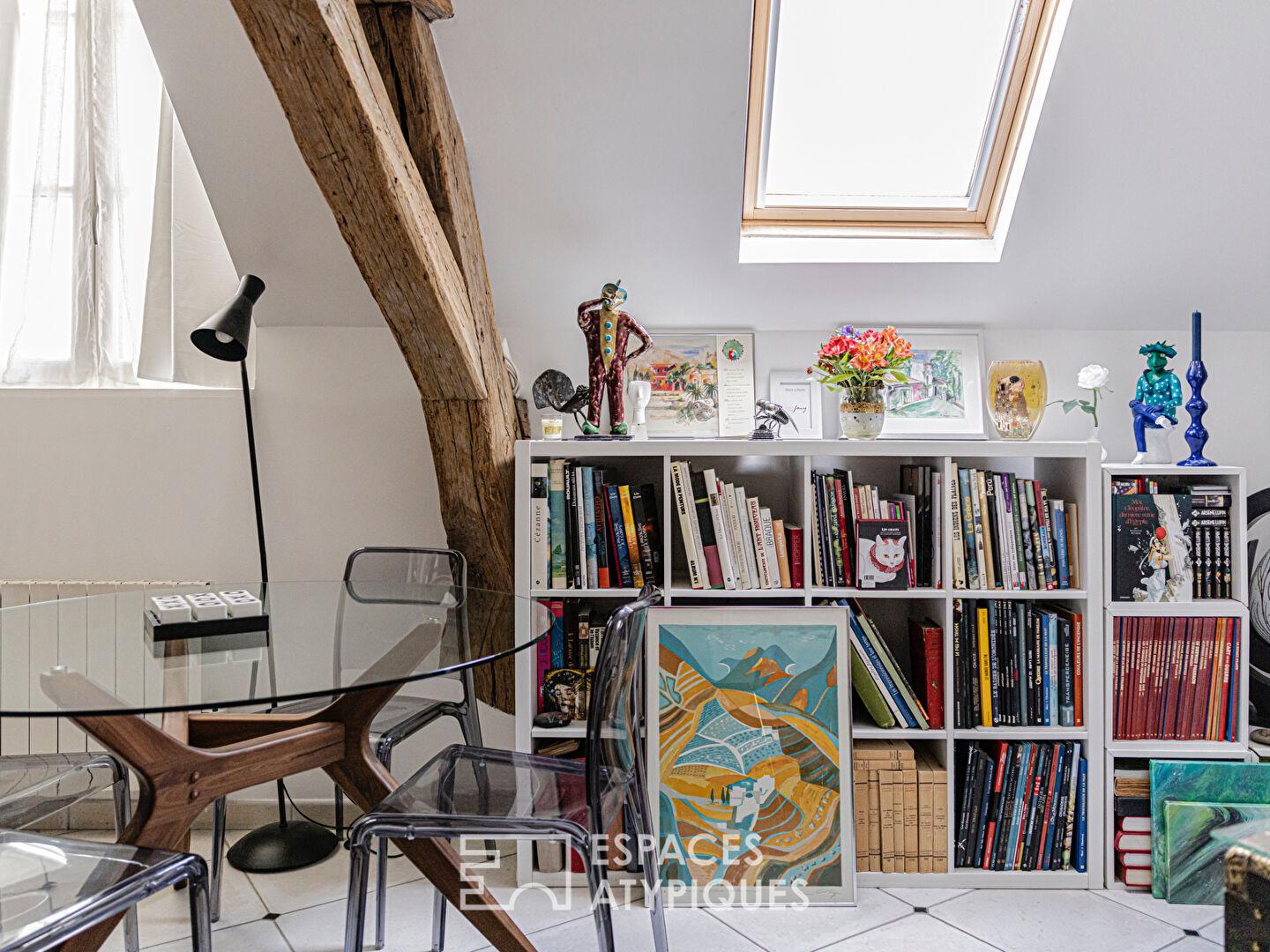 Au coeur du centre historique d’Orléans, dans un immeuble de caractère distingué par la Fondation du Patrimoine et sublimé par une rénovation complète en 2022, ce duplex singulier de 85 m² au sol (64 m² Carrez) déploie ses volumes au troisième étage, à l’abri des regards.