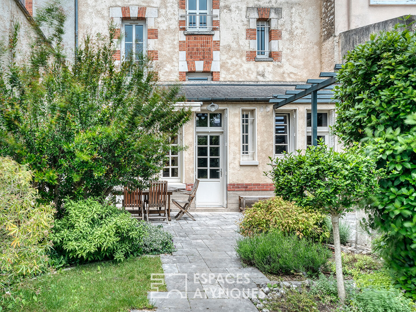 Coté extérieur, le joli jardin paysagé qui a su conserver son côté intimiste par ses murs hauts qui l’entourent, invite à la détente et offre un accès direct au garage attenant.