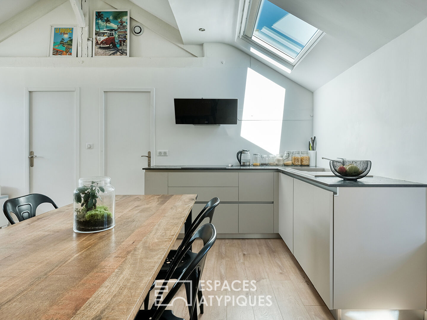 L’entrée mène à une grande pièce de vie dotée d’une cuisine ouverte où la décoration épurée en fait un cocon serein et lumineux.