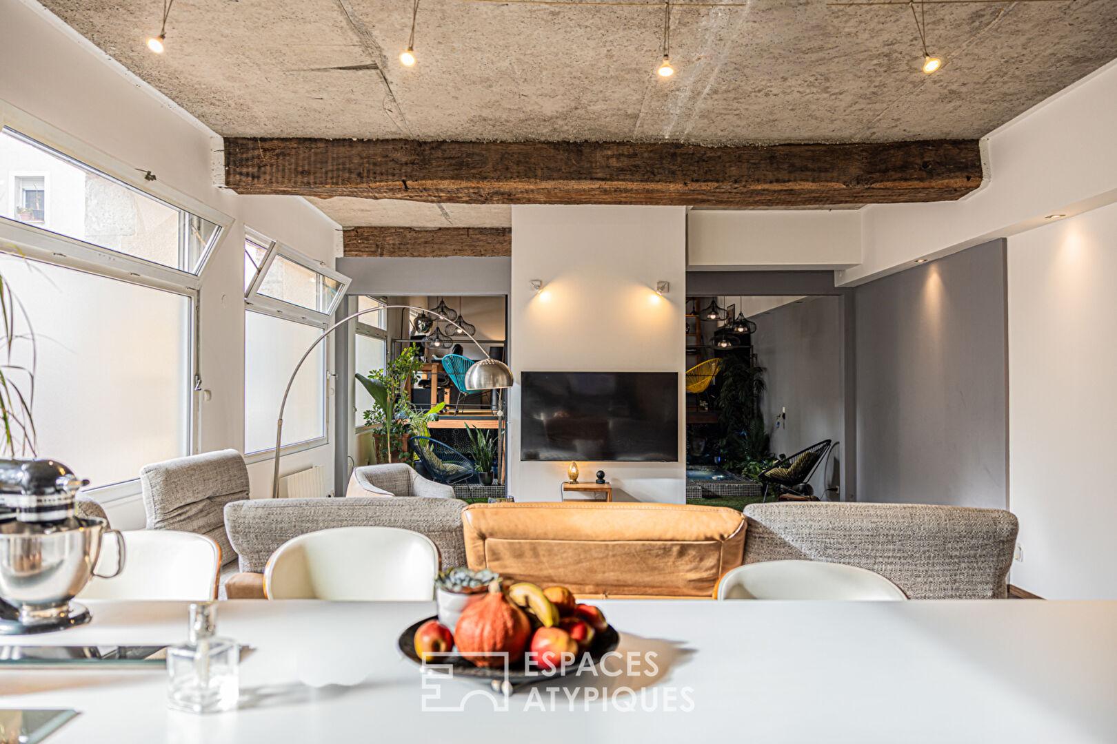 Cet appartement singulier séduit d’emblée par sa vaste pièce de vie baignée de lumière, orientée plein sud. Les volumes, les matériaux et l’agencement audacieux en font un lieu de vie à l’esprit résolument contemporain.