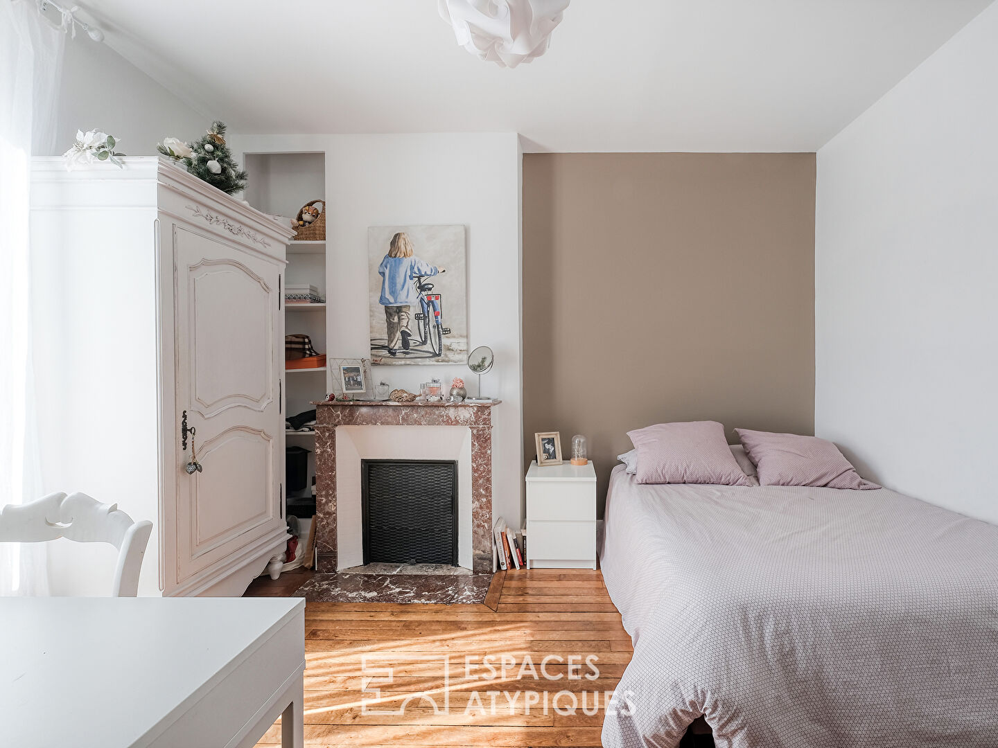 Au rez-de-chaussée, les pièces ayant conservé les éléments clés de sa construction (parquet, carrelage, cheminée) se succèdent et offrent des espaces lumineux et chaleureux.