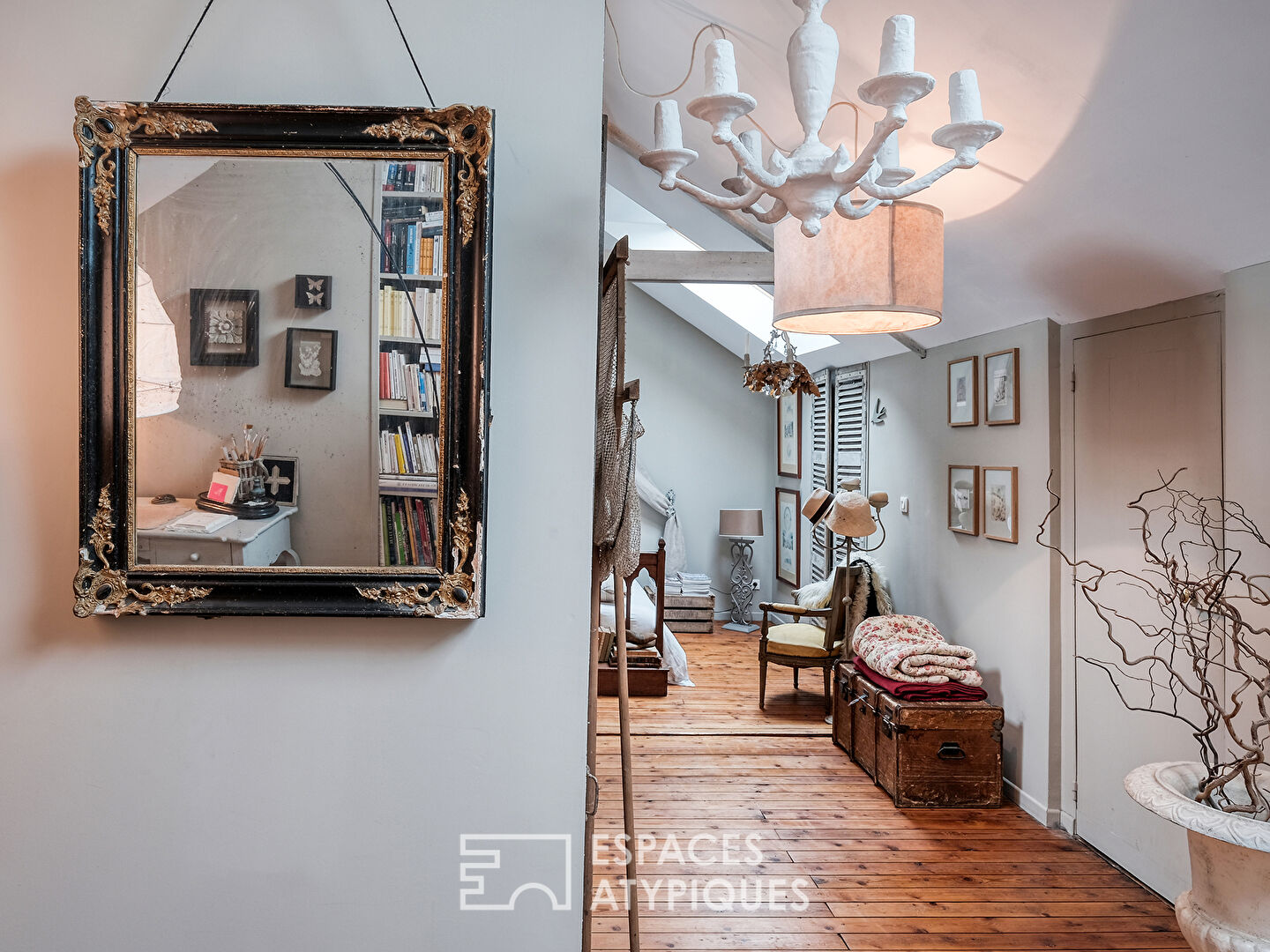 Cet espace intimiste dispose de beaux volumes et de deux dressings, une vaste salle d’eau, un espace nuit et un second espace bureau-bibliothèque idéal pour le télétravail ou les esprits créatifs.