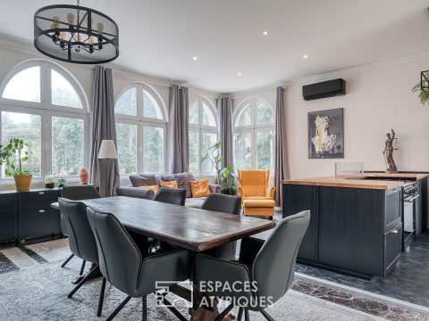 L’entrée s’ouvre vers une lumineuse pièce de vie d’environ 45m2 qui s’articule autour d’une cuisine contemporaine et son piano de cuisson, avec pour décor les chapiteaux et le marbre d’origine.