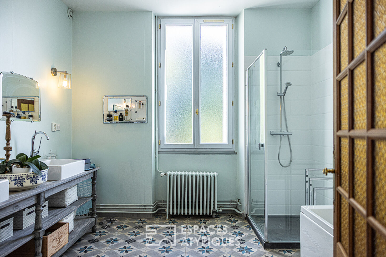 Dès l’entrée les carreaux de ciment d’origine mènent doucement vers le jardin arboré de plus de 500m2, comme une promesse de quiétude.