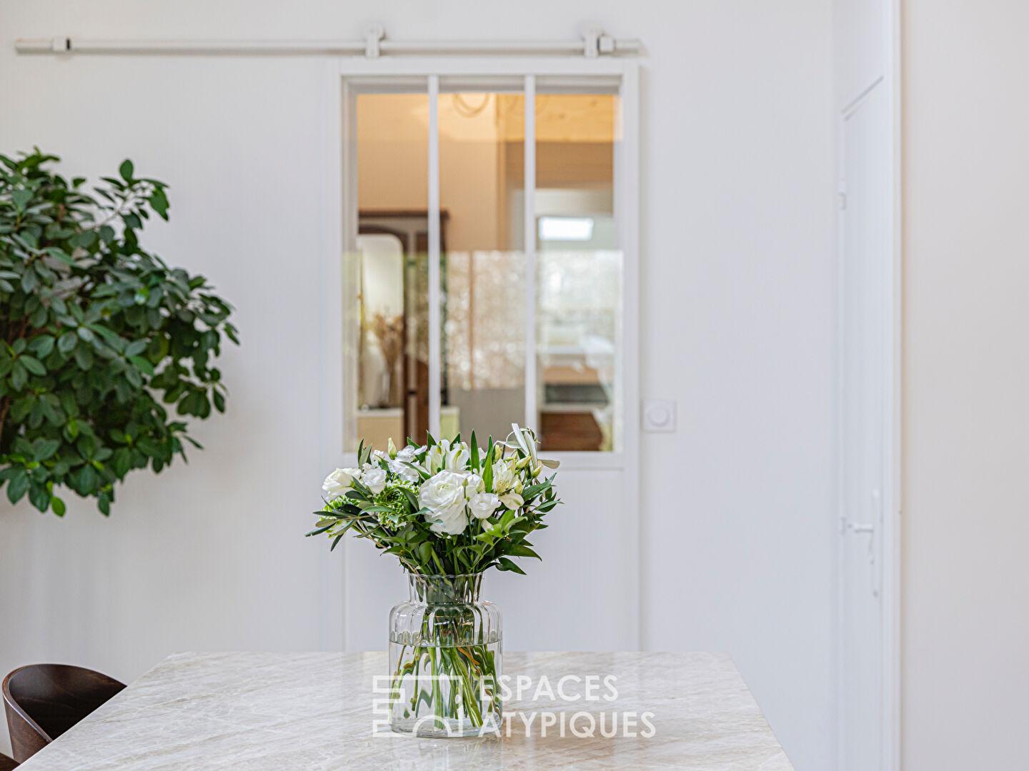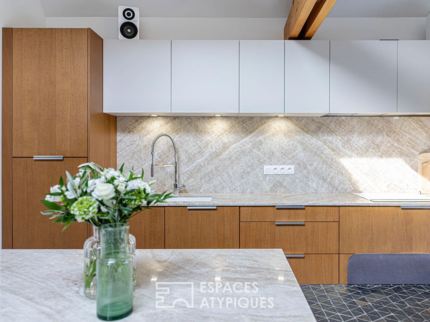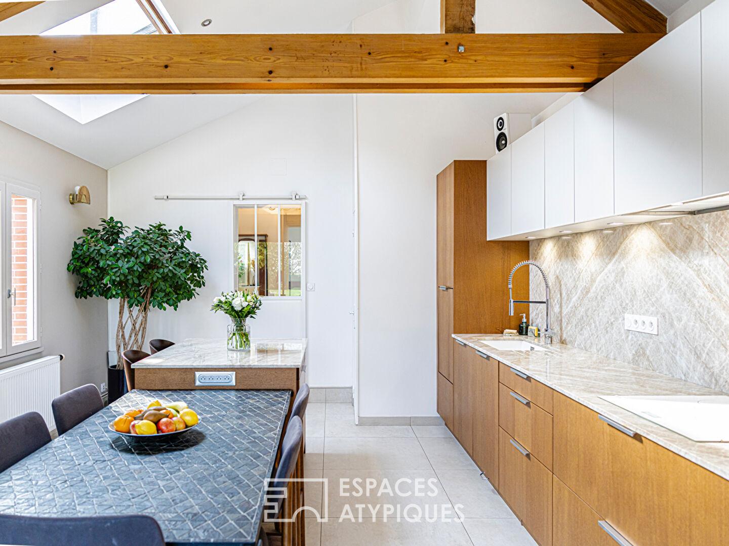 La cuisine attenante, séparée par une porte atelier, joue subtilement avec les transparences et prolonge cet esprit de convivialité moderne.