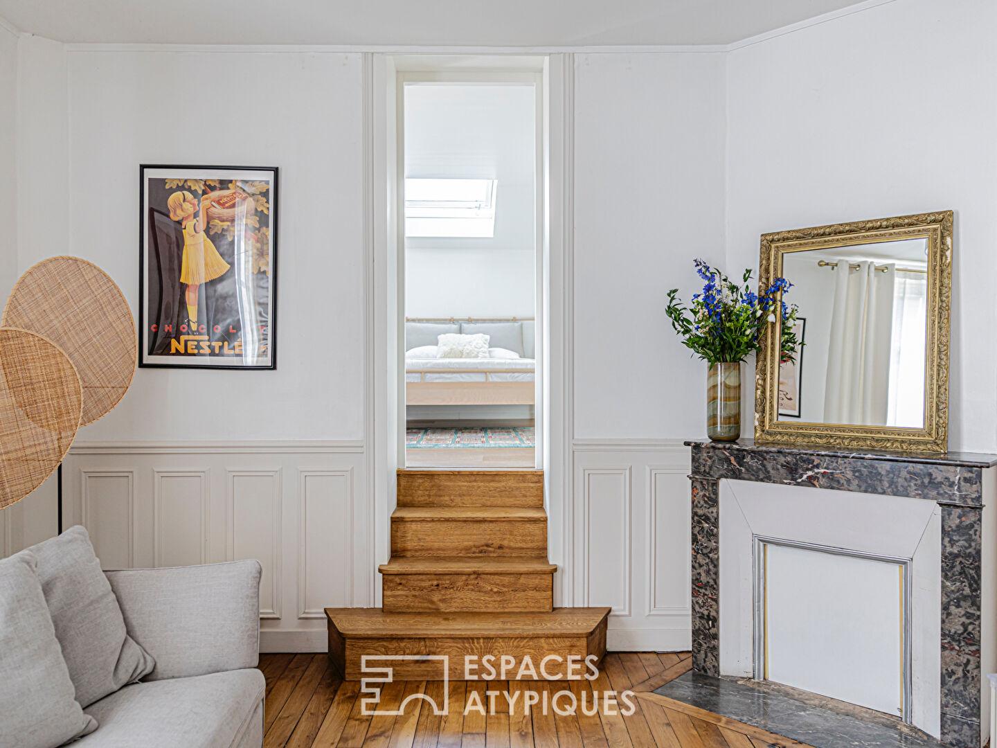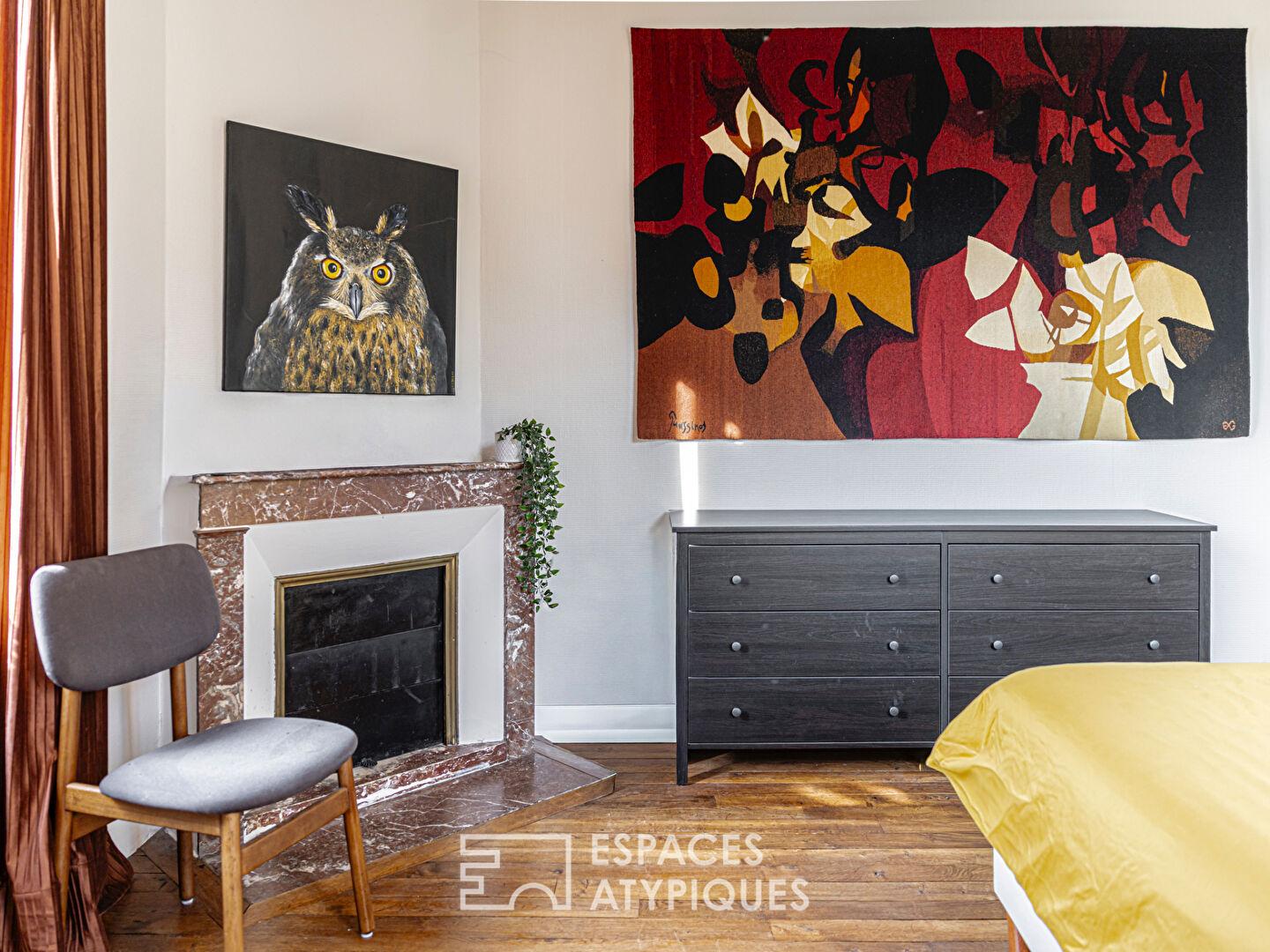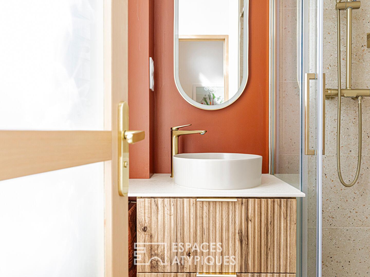 La cuisine attenante, séparée par une porte atelier, joue subtilement avec les transparences et prolonge cet esprit de convivialité moderne.