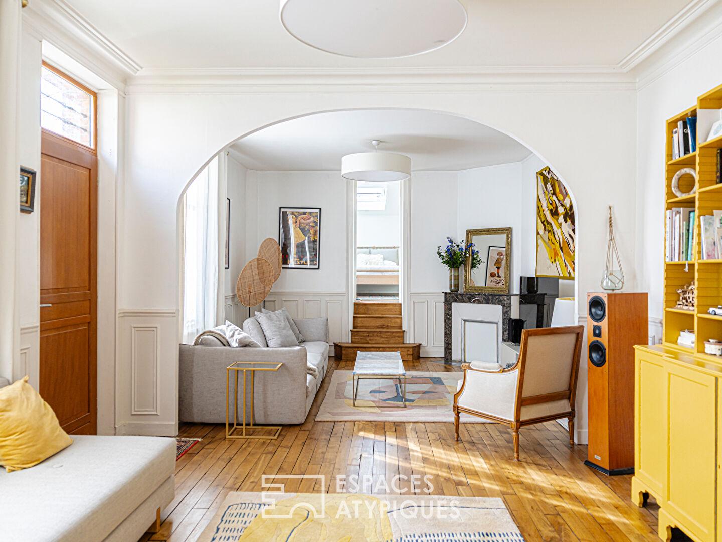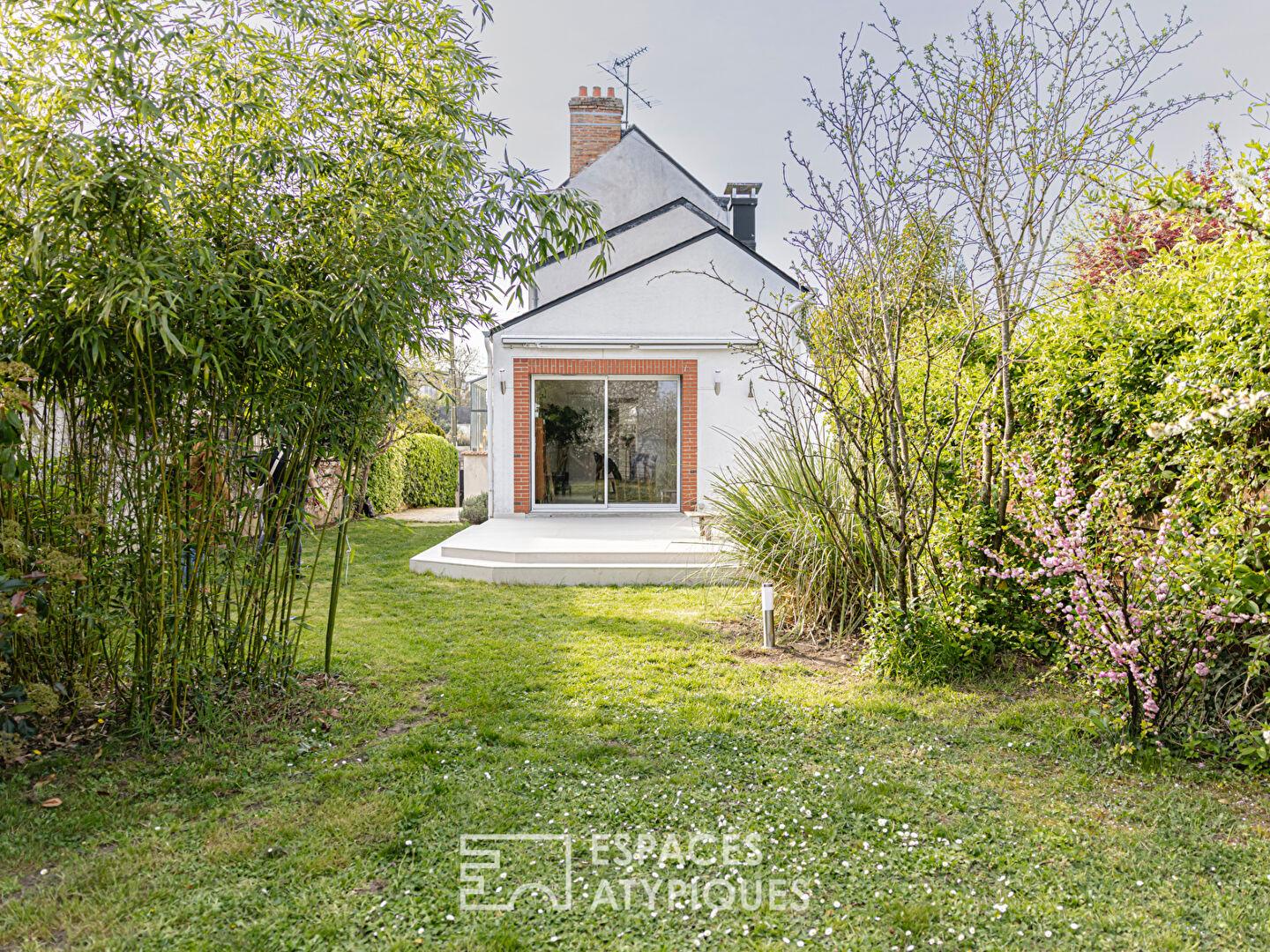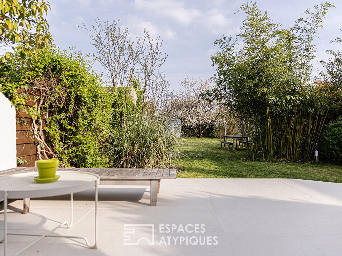 Derrière sa façade, cette maison d’environ 140 M2 avec son jardin d’environ 400 m2 dévoile un espace de vie tout en longueur, où les volumes s’expriment librement. Le salon et la salle à manger s’y déploient dans une atmosphère chaleureuse et lumineuse, propice aux moments partagés comme aux instants suspendus.