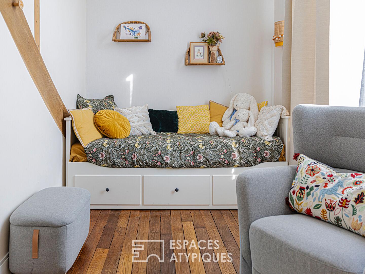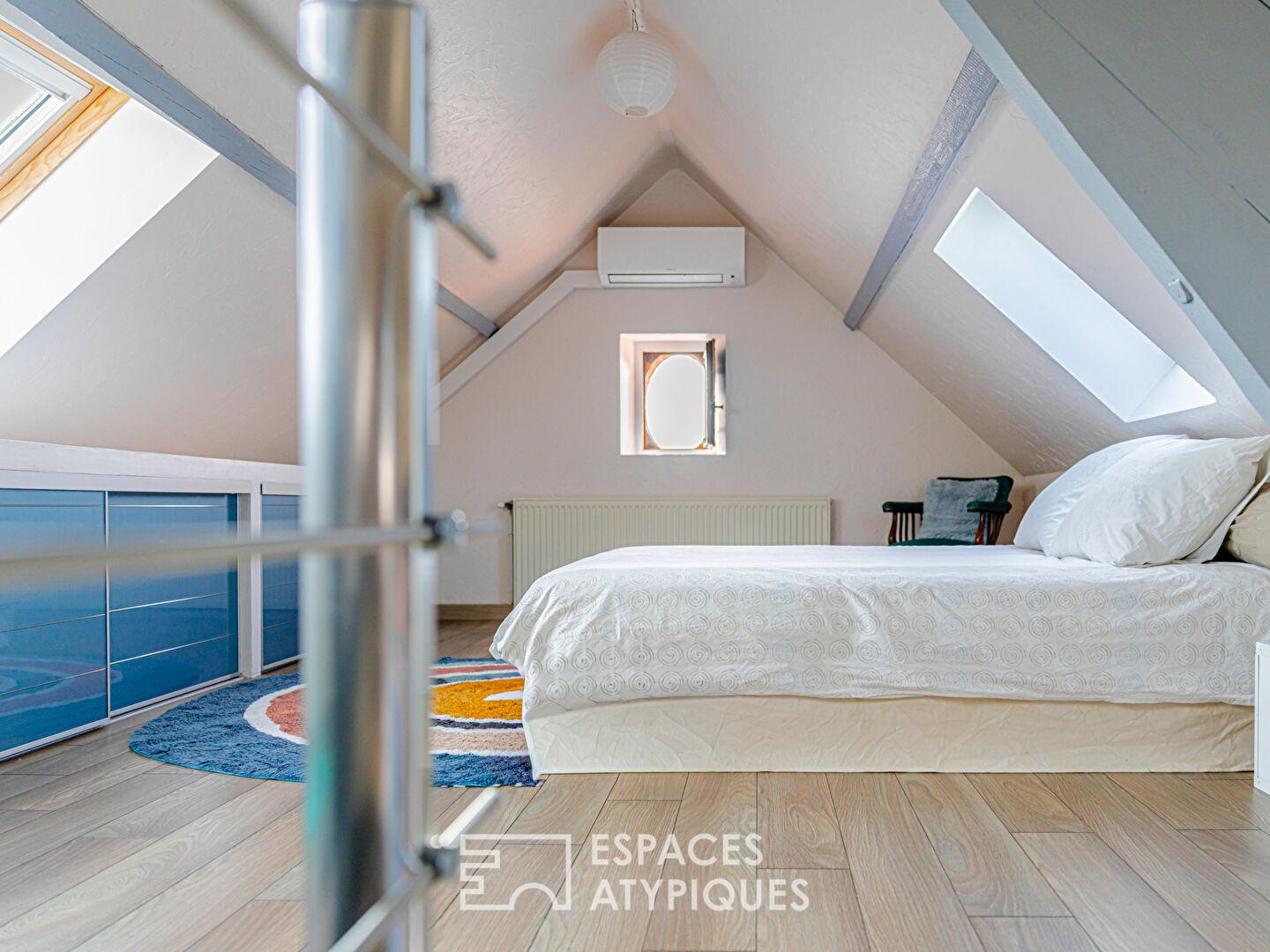 À l’étage, deux chambres accueillantes et une salle de bain composent un espace nuit fonctionnel et apaisant. Sous les toits, les combles aménagés révèlent une pièce remarquable par ses volumes, idéale pour une suite, un atelier ou un refuge personnel.