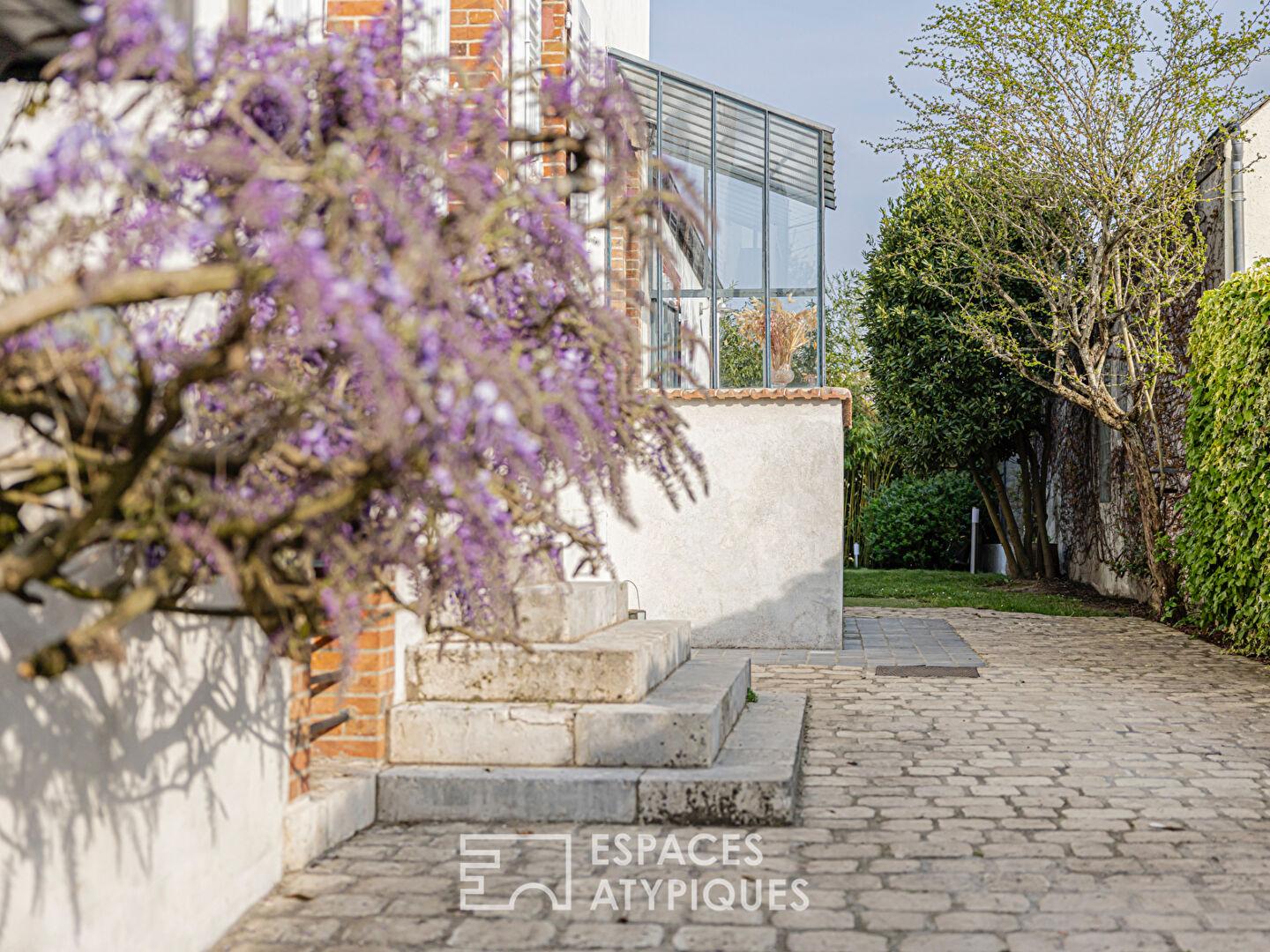 L’entrée se fait par une jolie véranda, véritable sas de transition baigné de lumière, qui donne immédiatement le ton.