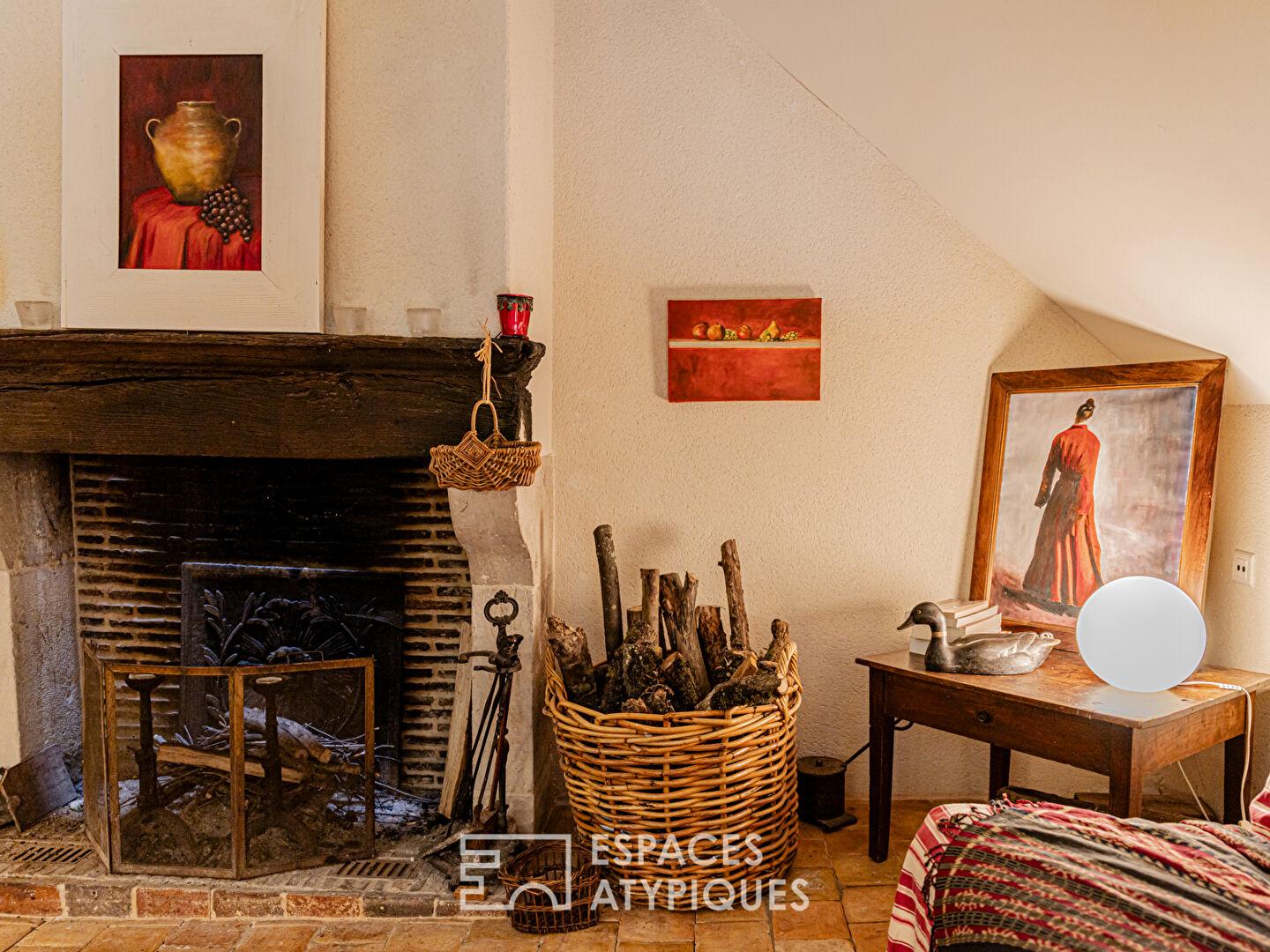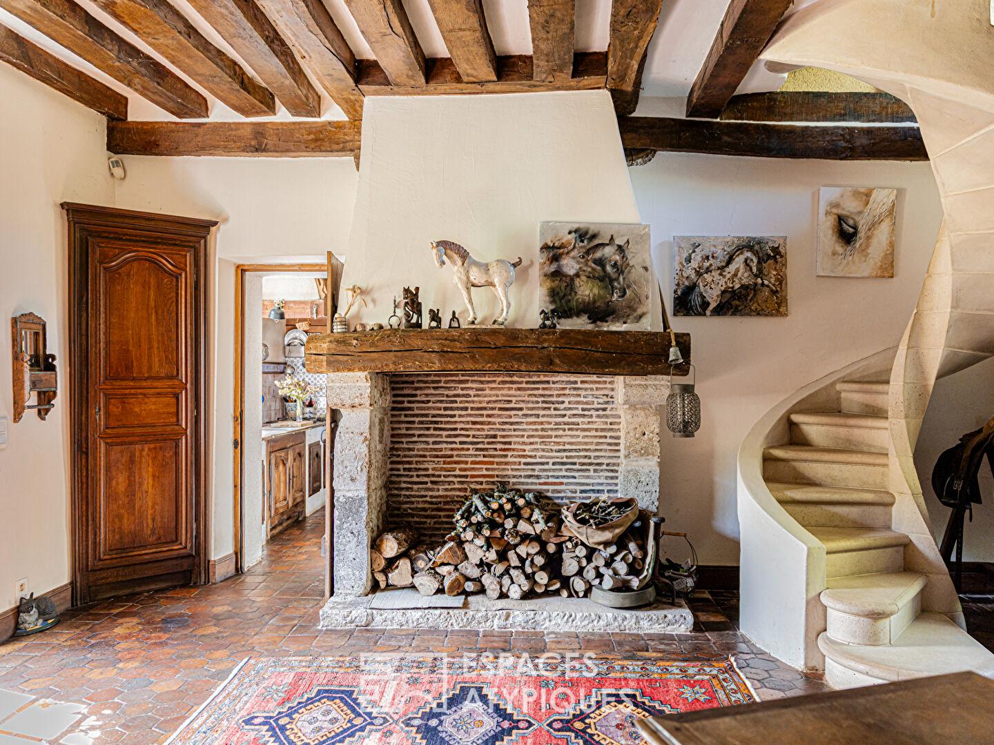 Dès l’entrée, une pièce d’accueil faisant office de bureau séduit par sa cheminée et son escalier colimaçon en pierre, signature du lieu.