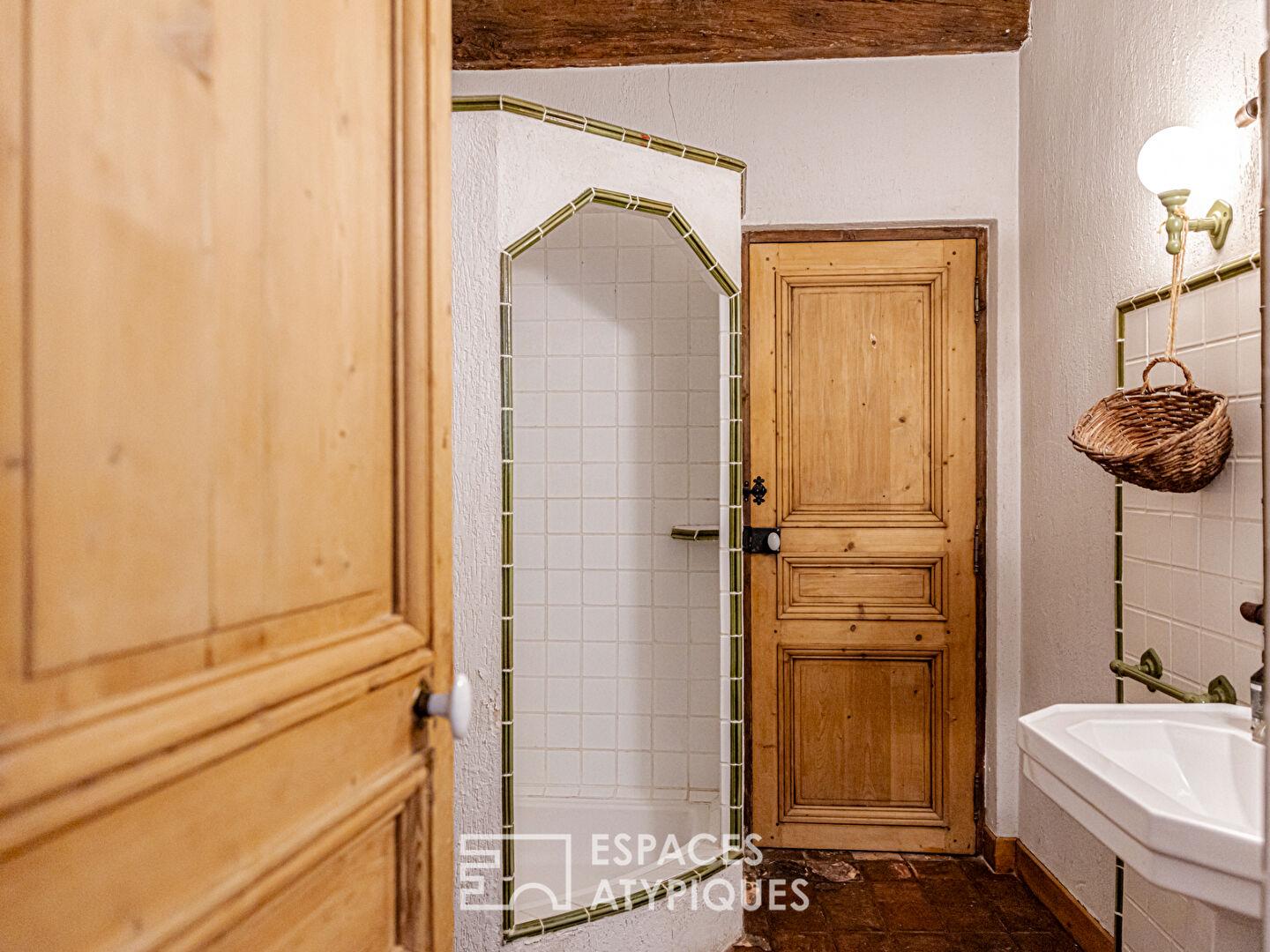 Sur la gauche, la cuisine indépendante précède un salon, salle-à-manger chaleureux avec une cheminée agrémentée d’un poêle à bois, prolongé par une chambre avec salle de bains. Les sols en tomettes et les poutres apparentes soulignent l’authenticité de cette maison ancienne.