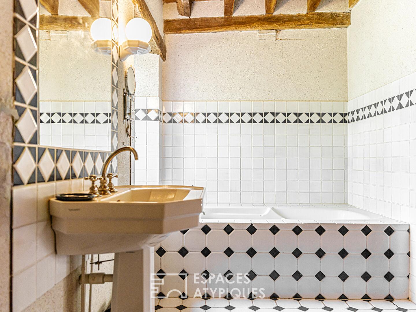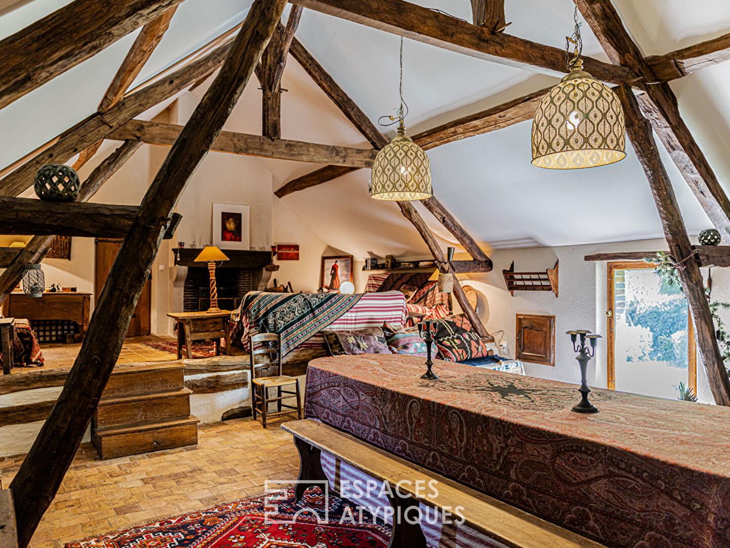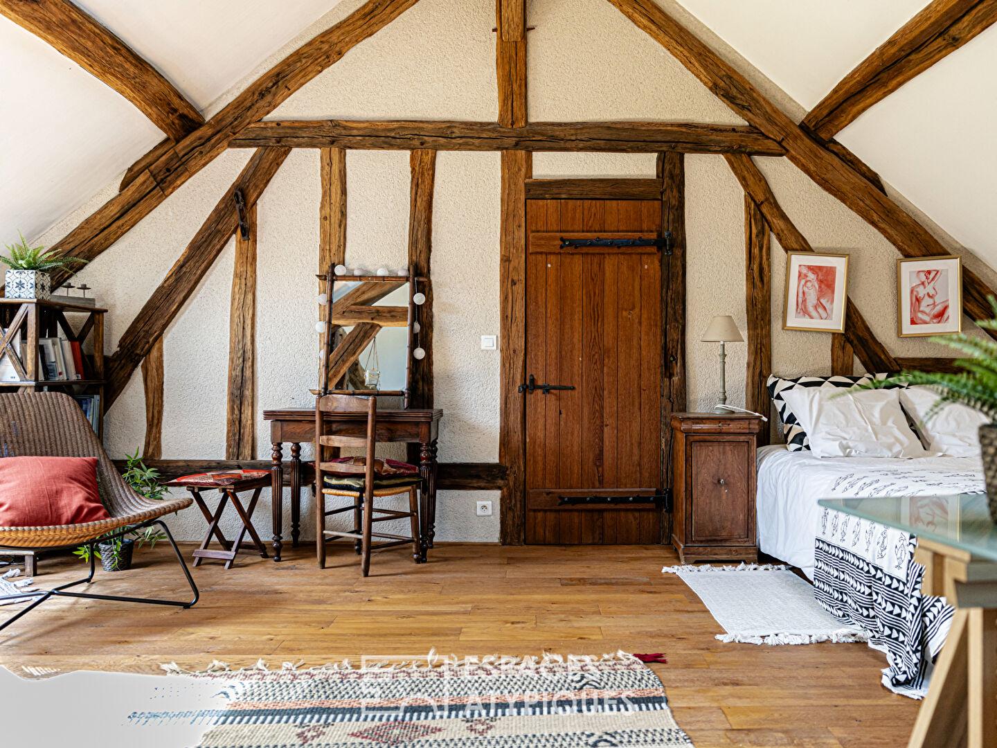À l’étage, un palier distribue une grande chambre avec salle d’eau, une chambre supplémentaire, une vaste pièce de réception avec cheminée, ainsi qu’un grenier offrant un potentiel supplémentaire d’aménagement.