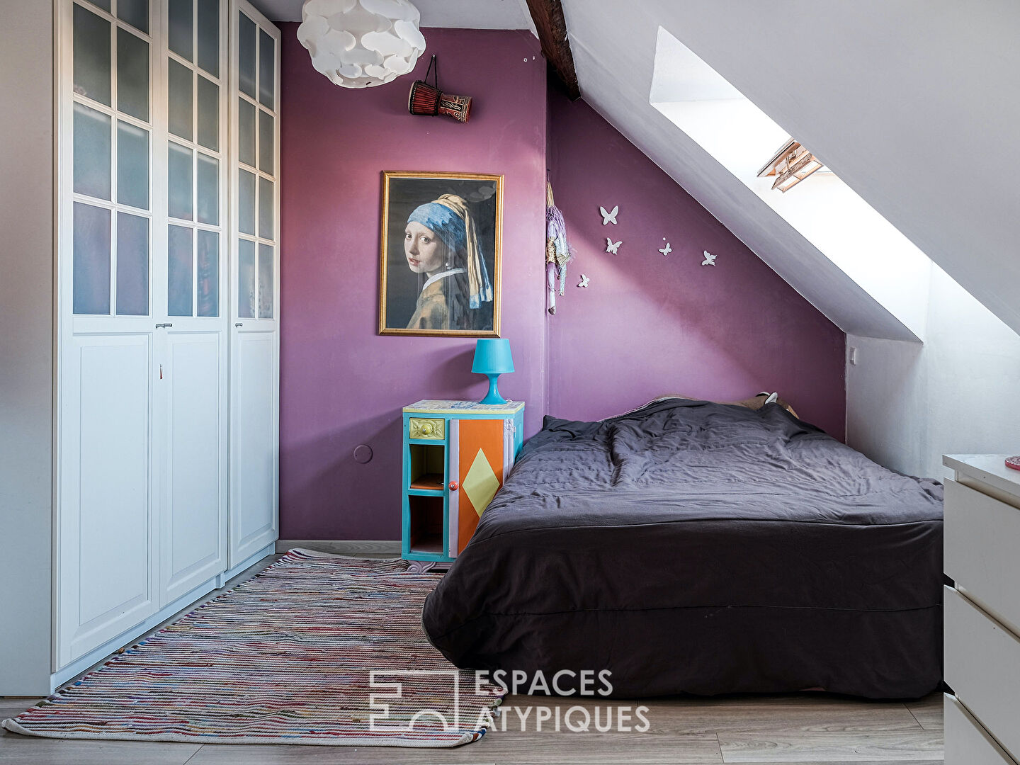 L’étage compte quant à lui deux chambres, un bureau et une salle de bain, mais aussi un grenier à aménager.