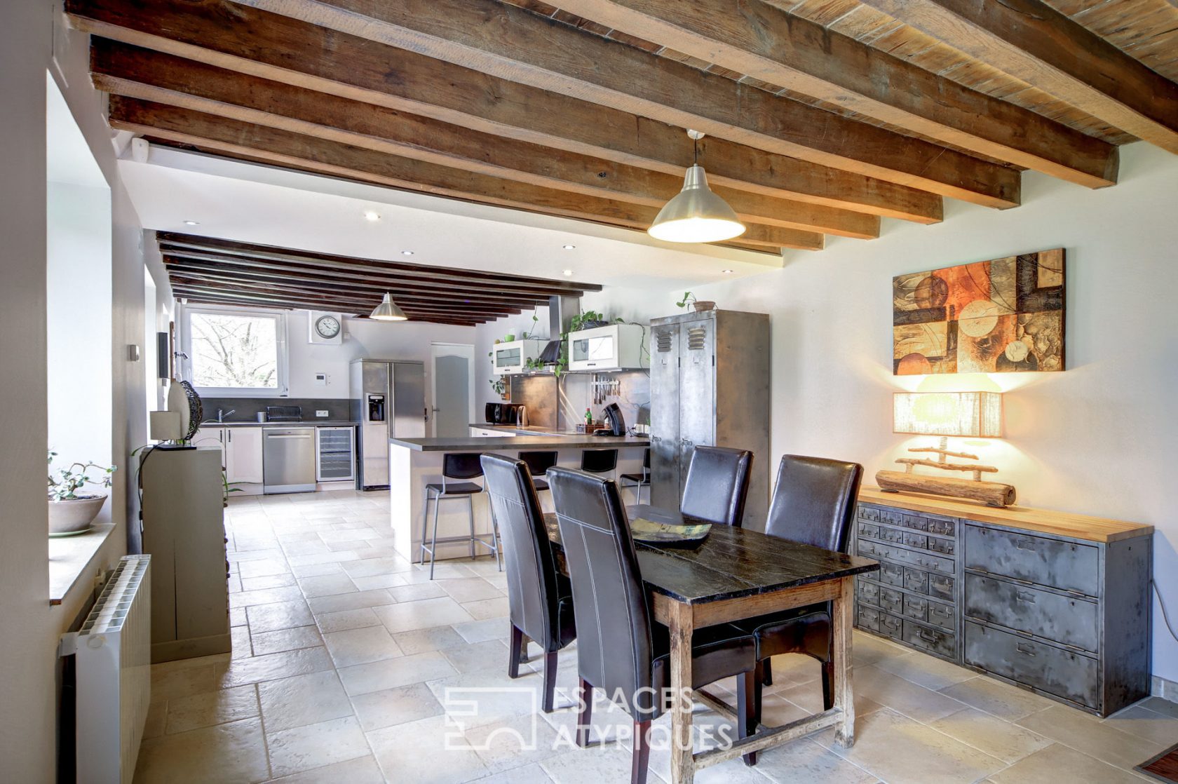 La découverte débute par le rez-de-chaussée de la maison principale. Vous y serez accueillis par une vaste et chaleureuse pièce de vie totalement ouverte dans laquelle les poutres d’époque et la rénovation sobre et élégante des sols et des murs se marient parfaitement. Depuis la cuisine aménagée vous êtes invités tout naturellement à profiter de la salle à manger puis du salon. Une salle d’eau avec coin buanderie vient compléter cet espace.