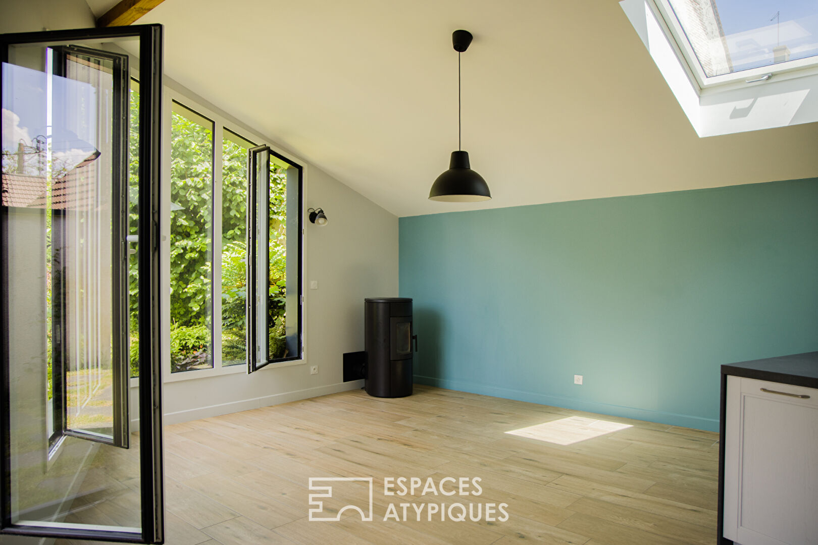 L’extension moderne réalisée par une architecte locale, baignée de lumière et offrant une vue superbe sur la verdure, est l’endroit idéal pour cuisiner ou se détendre avec un bon livre. Cette partie de la maison, à l’architecture aérée et contemporaine, constitue le coeur de la vie quotidienne.