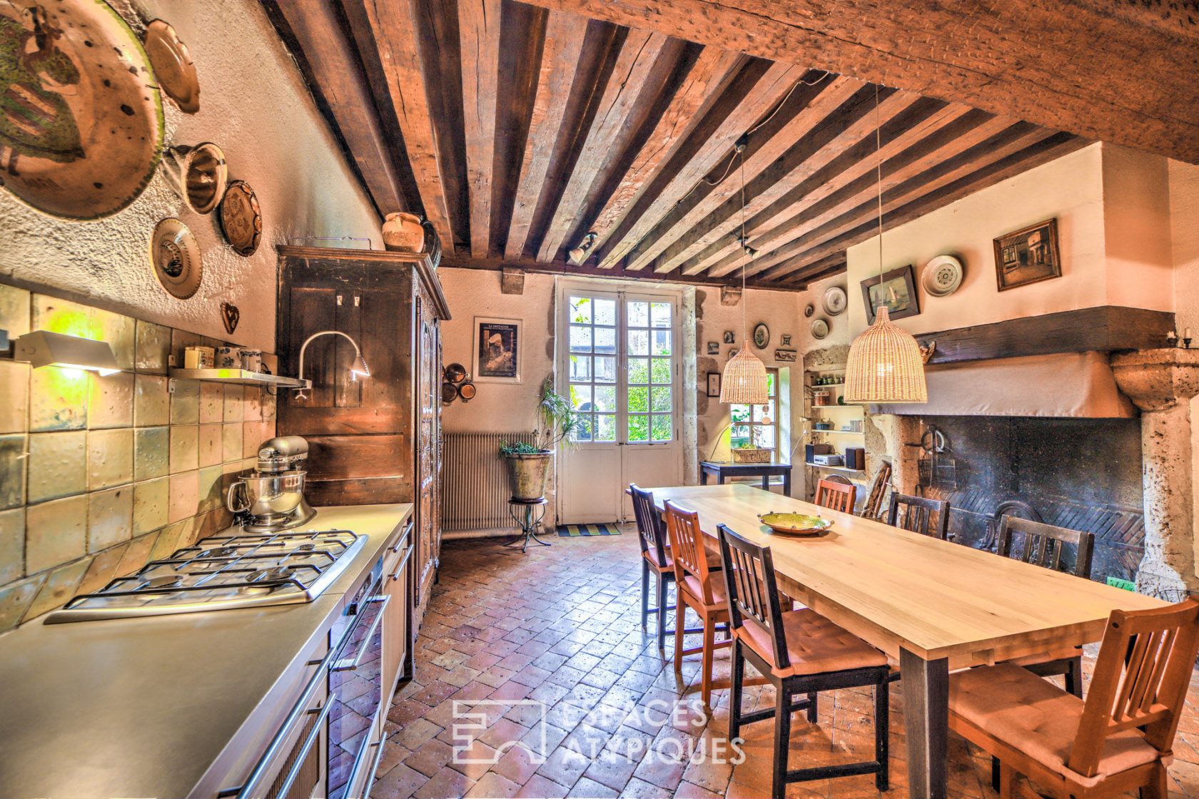 Dès le hall d’entrée, des escaliers et un long couloir laissent deviner la distribution atypique de l’habitation, qui permet convivialité et indépendance. En entrant dans le couloir, le charme de la pierre, et des tomettes saisissent. C’est en entrant dans le salon que l’on apprécie pleinement la hauteur des plafonds à la française dont la rénovation en châtaignier a été approuvée par les bâtiments de France. C’est le crépitement du feu de bois, qui attirera les visiteurs dans la grande cuisine familiale de 30 m2 qui donne sur un jardinet. La cheminée où sont encore aujourd’hui cuits les mets qui délectent la famille lors des retrouvailles. En fond de pièce une porte mène à un second accès au jardin et à un second escalier, l’escalier sud.