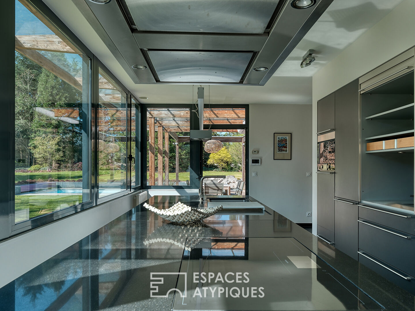 La cuisine haut de gamme entièrement équipée impressionne par ses volumes et ses larges ouvertures sur la nature et les différentes terrasses. A la suite, la salle à manger offre une vue et un accès direct aux extérieurs.