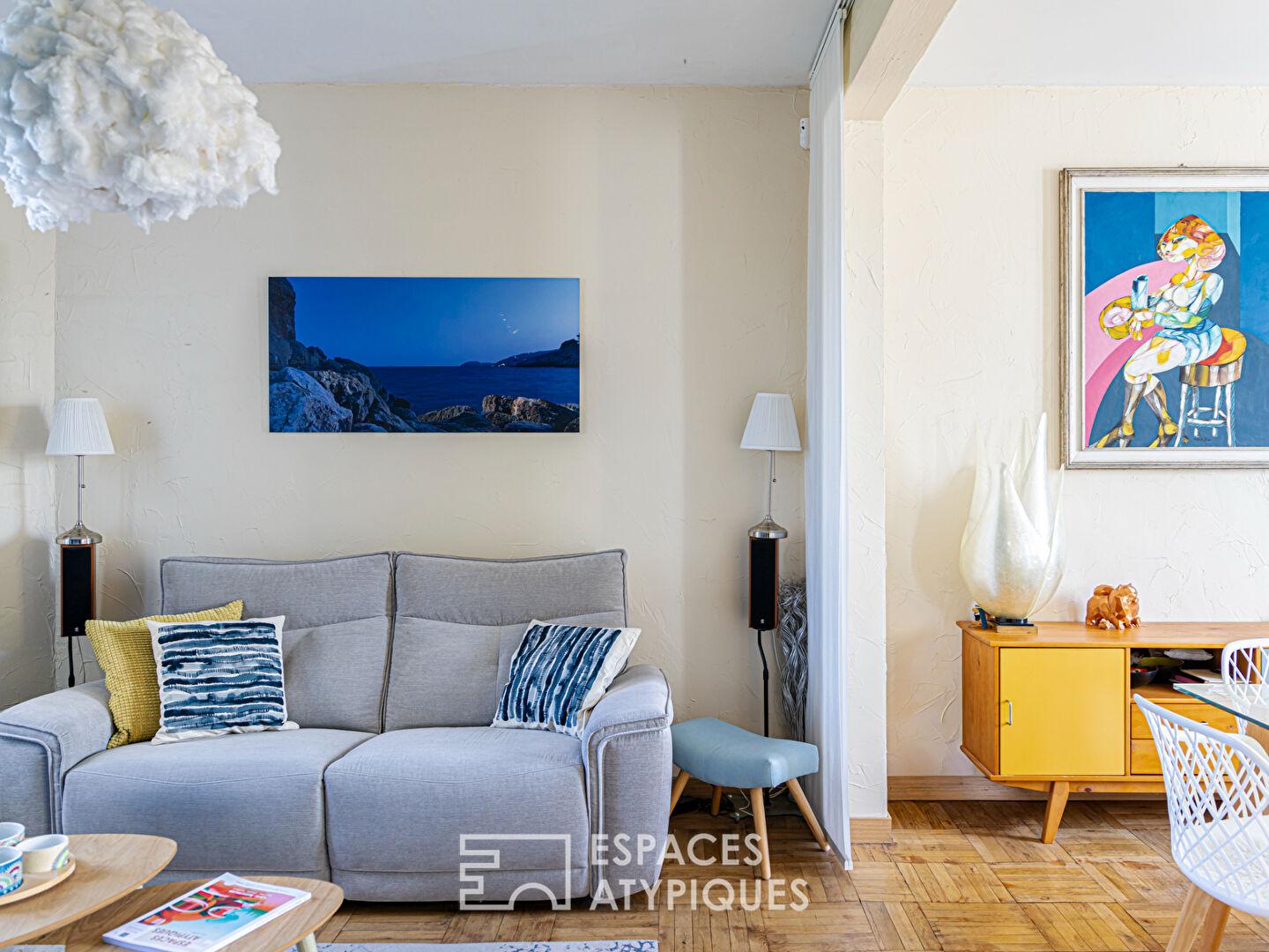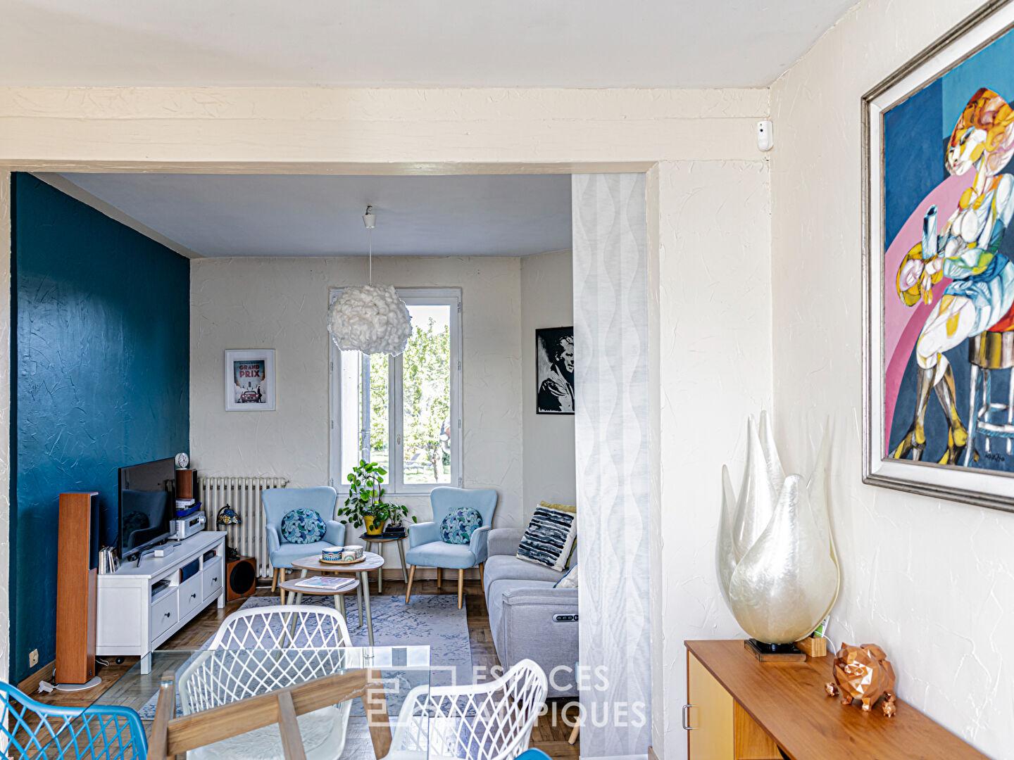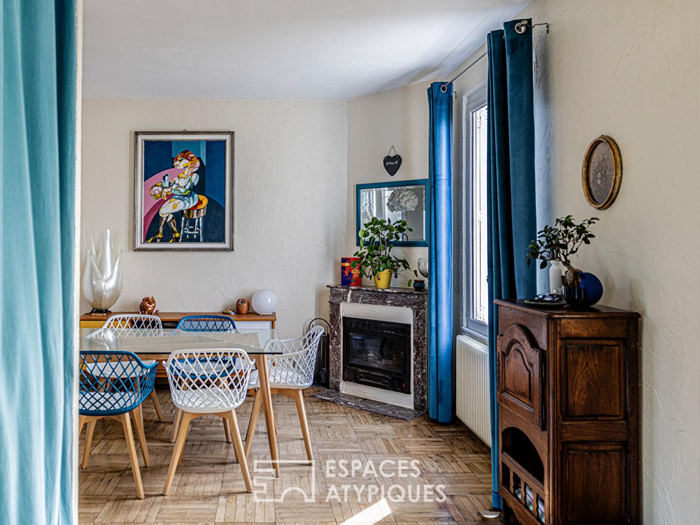 L’entrée s’ouvre sur une pièce de vie traversante, baignée de lumière naturelle. À droite, une salle à manger chaleureuse agrémentée d’une cheminée en marbre avec insert prolonge un salon convivial. À gauche, un second salon aménagé en bibliothèque mène à une cuisine fonctionnelle et colorée donnant accès à la terrasse.