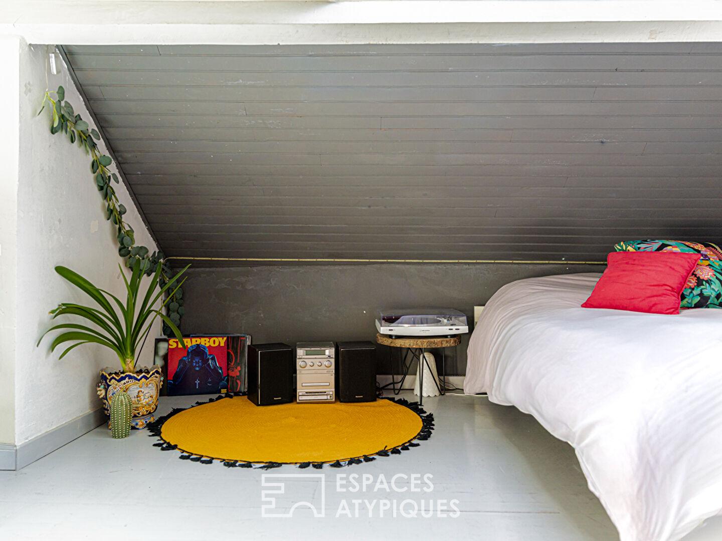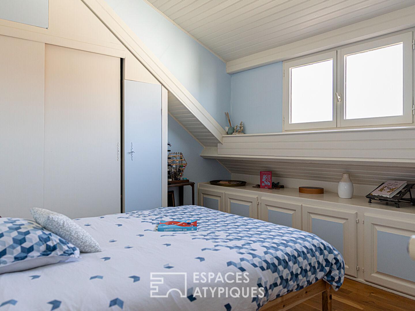 L’étage accueille un palier distribuant trois chambres mansardées, un bureau et une salle de bains.