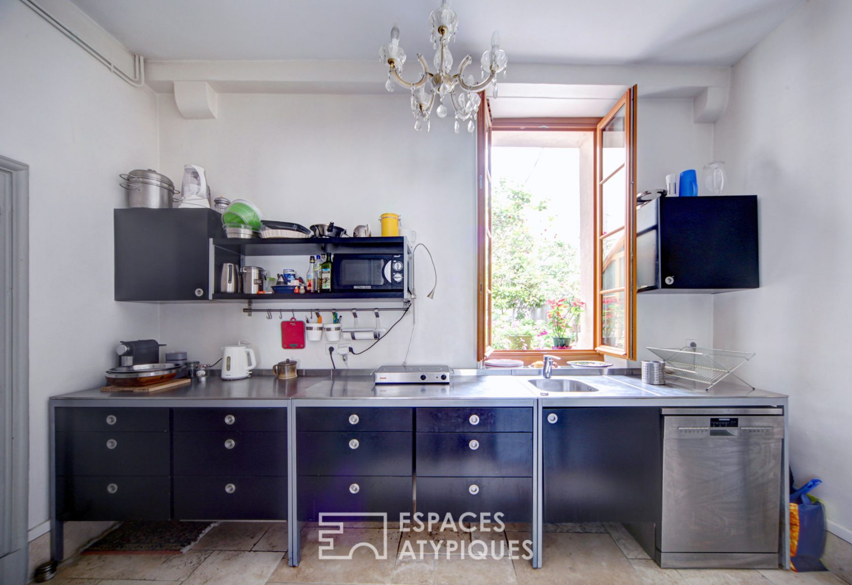 Les généreux volumes recouverts d’un parquet massif évoquent l’héritage d’un âge d’or où moulures et travail de la pierre accompagnent de beaux espaces de vie. L’entrée dessert une belle cuisine moderne donnant une vue magnifique sur la cour pavée agrémentée de jolies plantations.