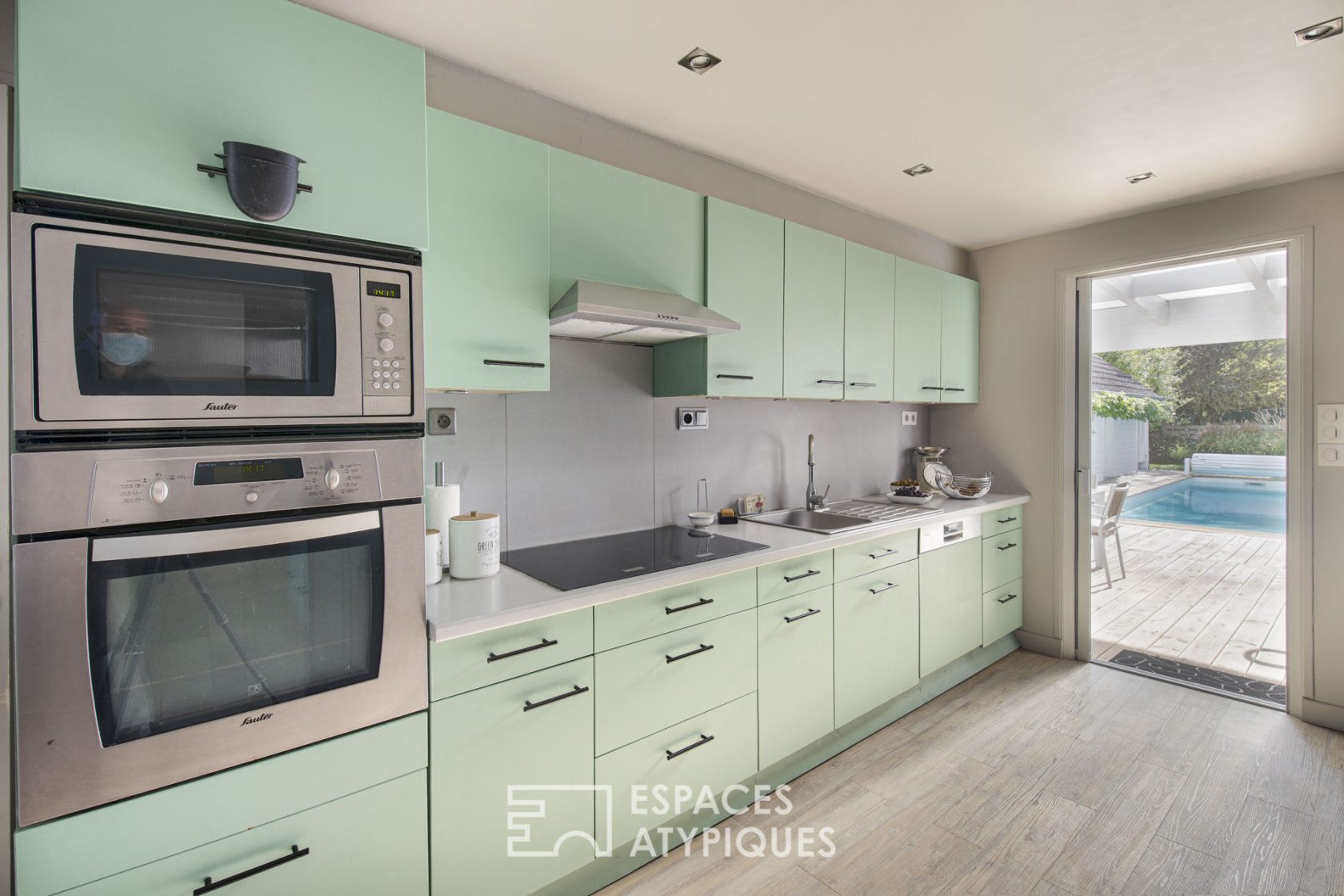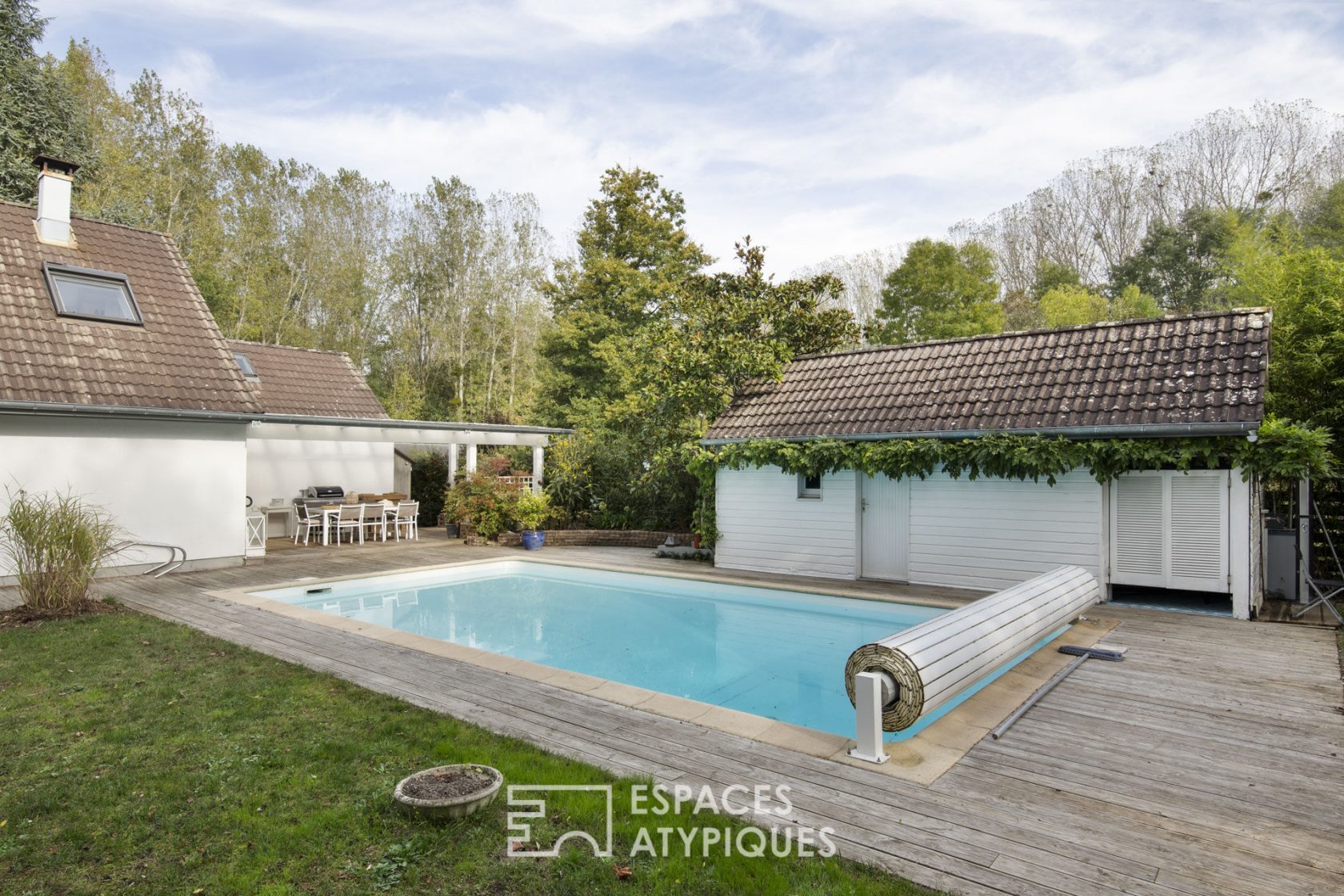Niché dans un cadre verdoyant et au calme, ce pavillon développe une surface d’environ 180 m² , avec un jardin de 895 m2 avec piscine chauffée. Derrière sa façade, se cache en toute discrétion de grands et beaux volumes baignés de lumière.