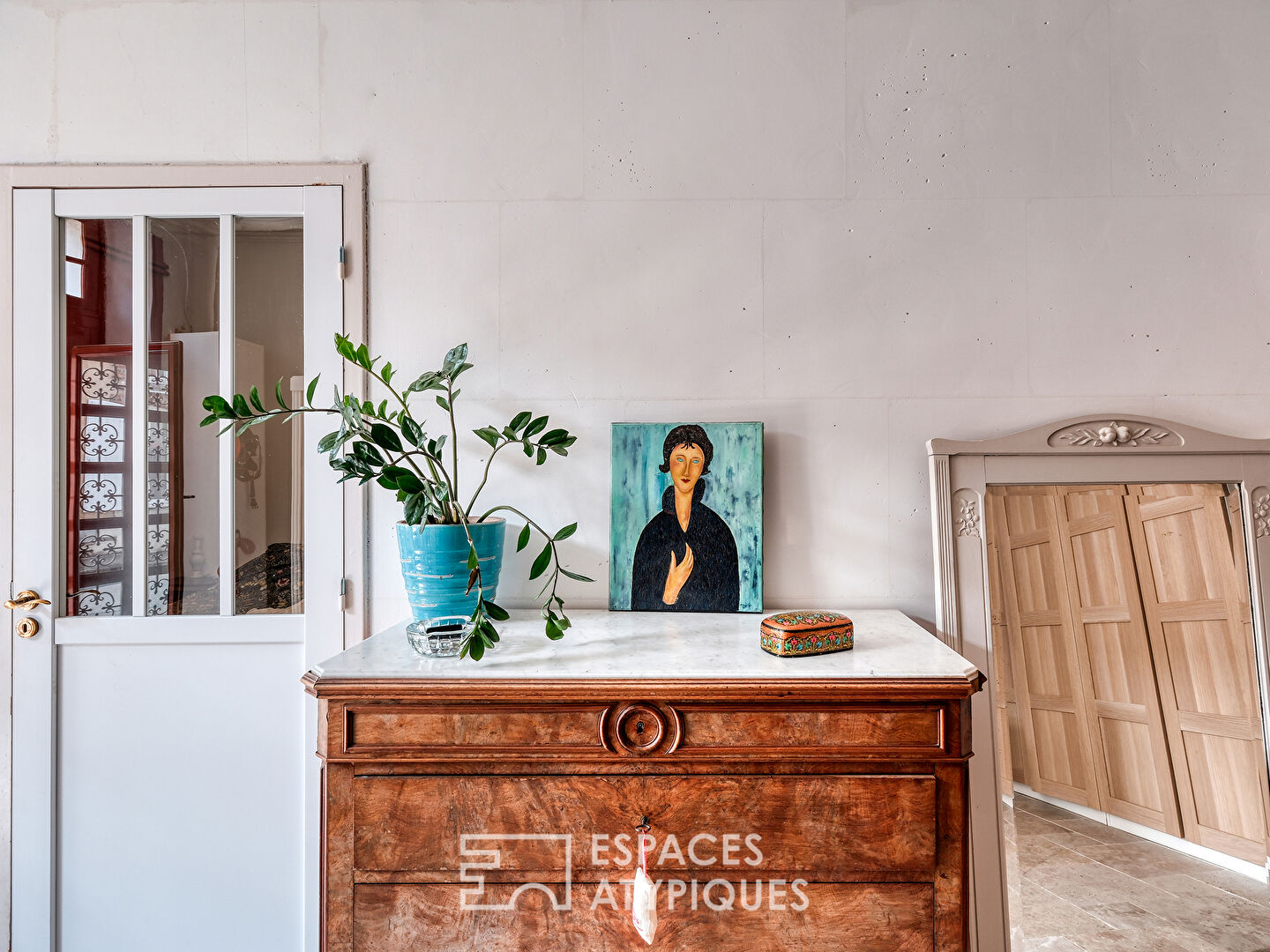 A l’étage, un spacieux palier dessert une salle de bain claire agrémentée d’un meuble détourné pour être aujourd’hui un joli meuble vasque. Ce sont ensuite trois chambres, dont l’une d’elle est la réunion de deux chambres à l’origine, toutes aux tons doux.