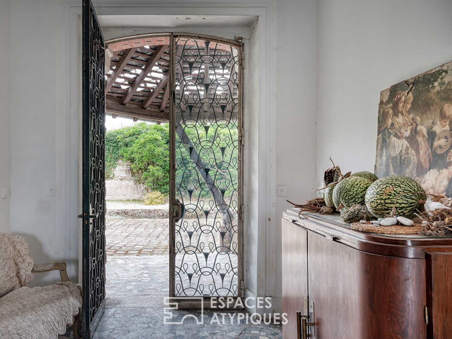 L’impressionnant hall d’entrée dévoile un sol en terrazzo de marbre ainsi que deux grandes portes vitrées, décorées de grilles en ferronnerie d’art datant de l’exposition universelle de Paris, l’une d’elles s’ouvrant sur la terrasse apportant profondeur et luminosité.