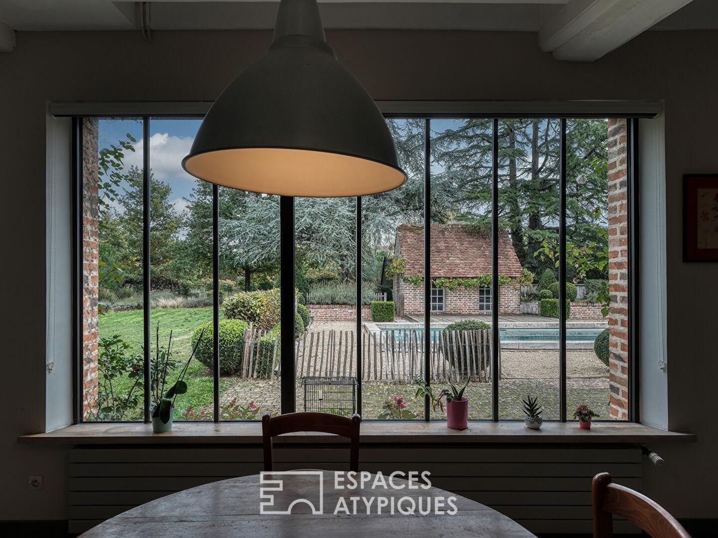 Dès l’arrivée, un chemin privatif mène à la propriété et dévoile une façade en brique rouge typique de l’architecture locale. Chaleureuse et lumineuse, la maison se déploie sur deux niveaux avec de beaux volumes et une circulation fluide. Le rez-de-chaussée s’ouvre sur une entrée desservant un vaste séjour traversant baigné de lumière, sublimé par une verrière offrant une agréable vue sur le jardin. La cuisine indépendante, aménagée et équipée, communique à la fois avec l’espace de vie et avec une terrasse en bois idéale pour les repas en extérieur. Dans le prolongement, un espace nuit propose cinq chambres confortables ainsi que deux salles d’eau, complété par un bureau et un cellier.