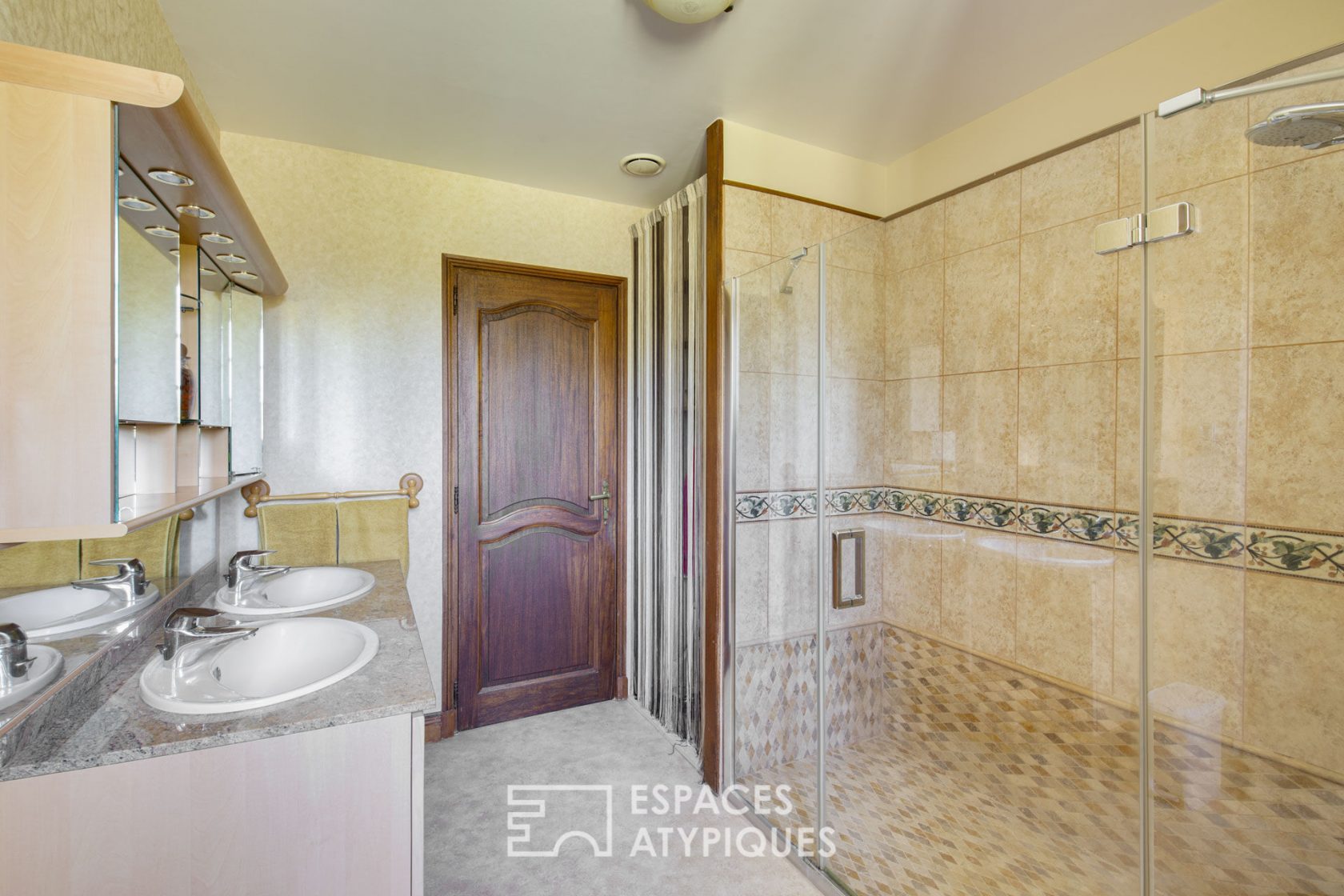 L’escalier en bois situé dans l’entrée mène sur un palier desservant une vaste suite parentale avec dressing. L’étage propose également quatre chambres particulièrement spacieuses disposant chacune de leur salle de bain. La propriété comprend également deux dépendances à réhabiliter. Une piscine hors sol chauffée vient compléter ce bien.