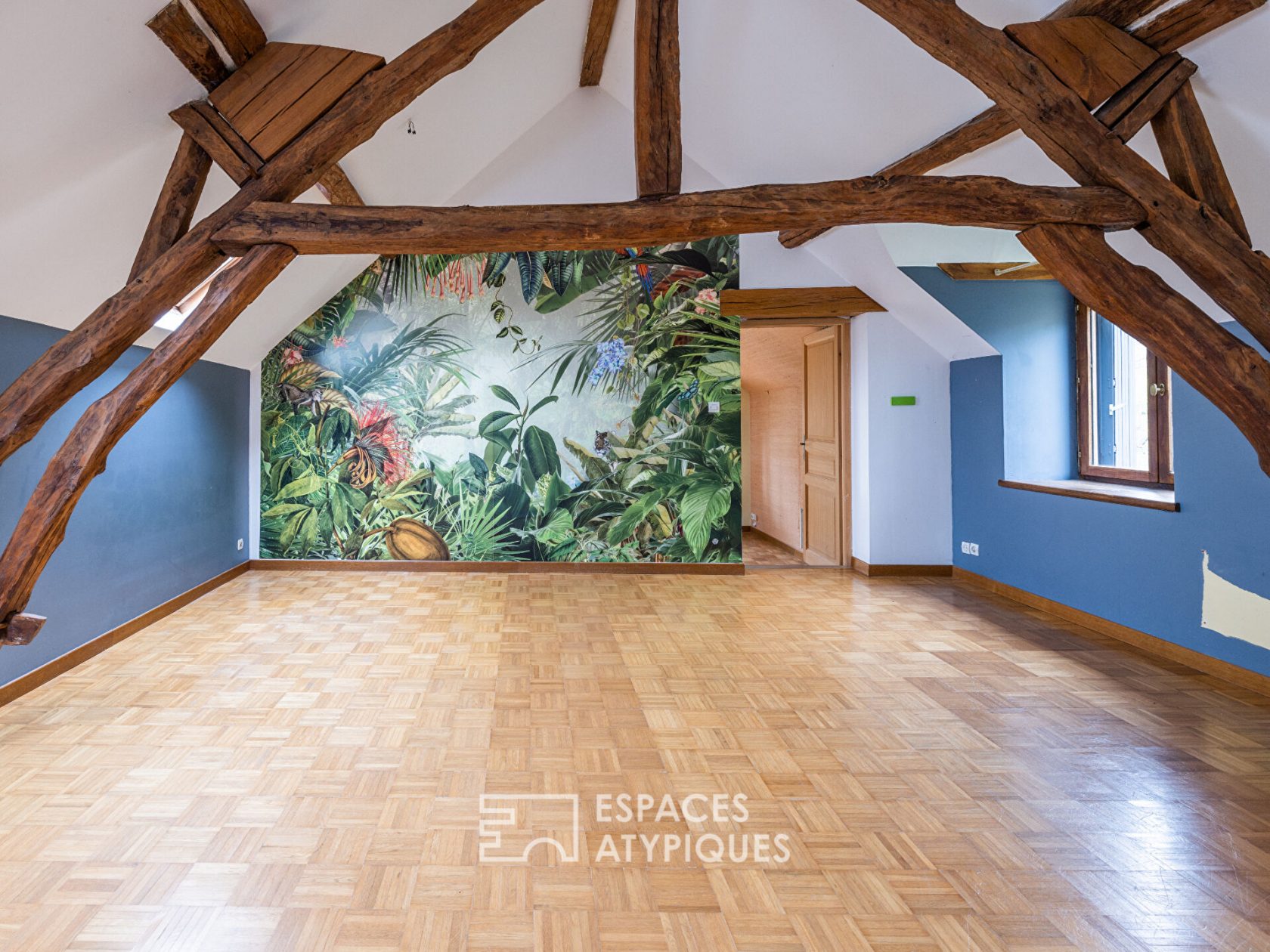 A l’étage, un palier lumineux dessert une salle de bains et trois chambres dont deux à la suite l’une de l’autre. Le caractère de la maison et les matériaux authentiques se retrouvent également dans cet espace nuit : charpente apparente, parquet en damier, mur en pierre, belle hauteur sous plafond.